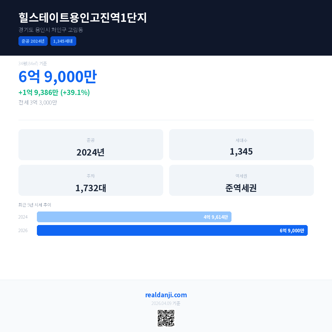 힐스테이트용인고진역1단지 국민평형 기준 2026년 평균 거래가는 6억 9,000만으로, 전년 대비 39.1% 상승 했습니다.
