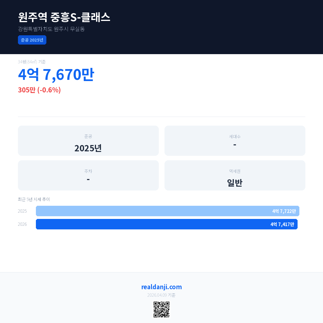 원주역 중흥S-클래스 국민평형 기준 2026년 평균 거래가는 4억 7,417만으로, 전년 대비 0.6% 하락 했습니다.