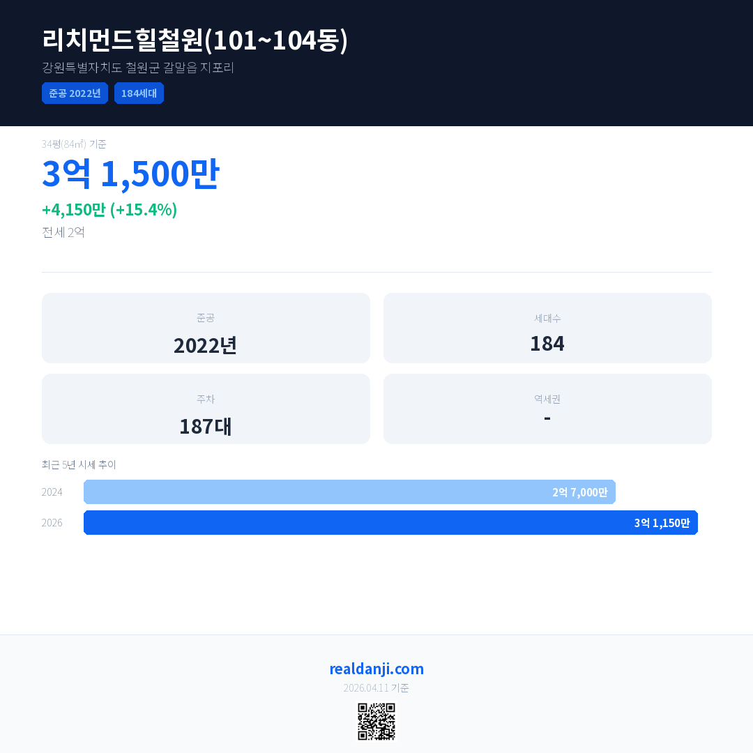 리치먼드힐철원(101~104동) 국민평형 기준 2026년 평균 거래가는 3억 1,150만으로, 전년 대비 15.4% 상승 했습니다.