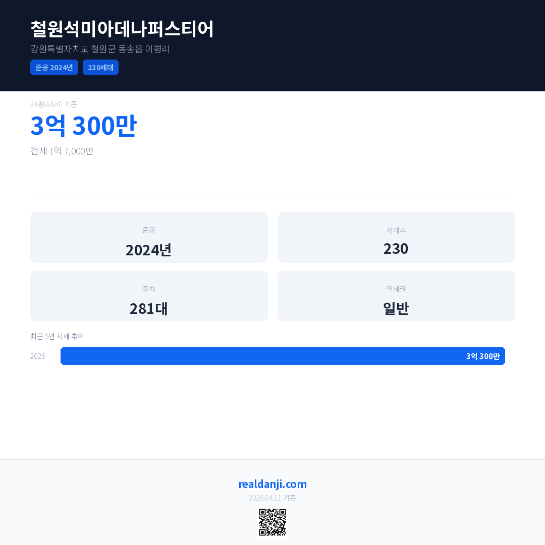 철원석미아데나퍼스티어 최근 거래가는 3억 300만입니다. (2026-03)