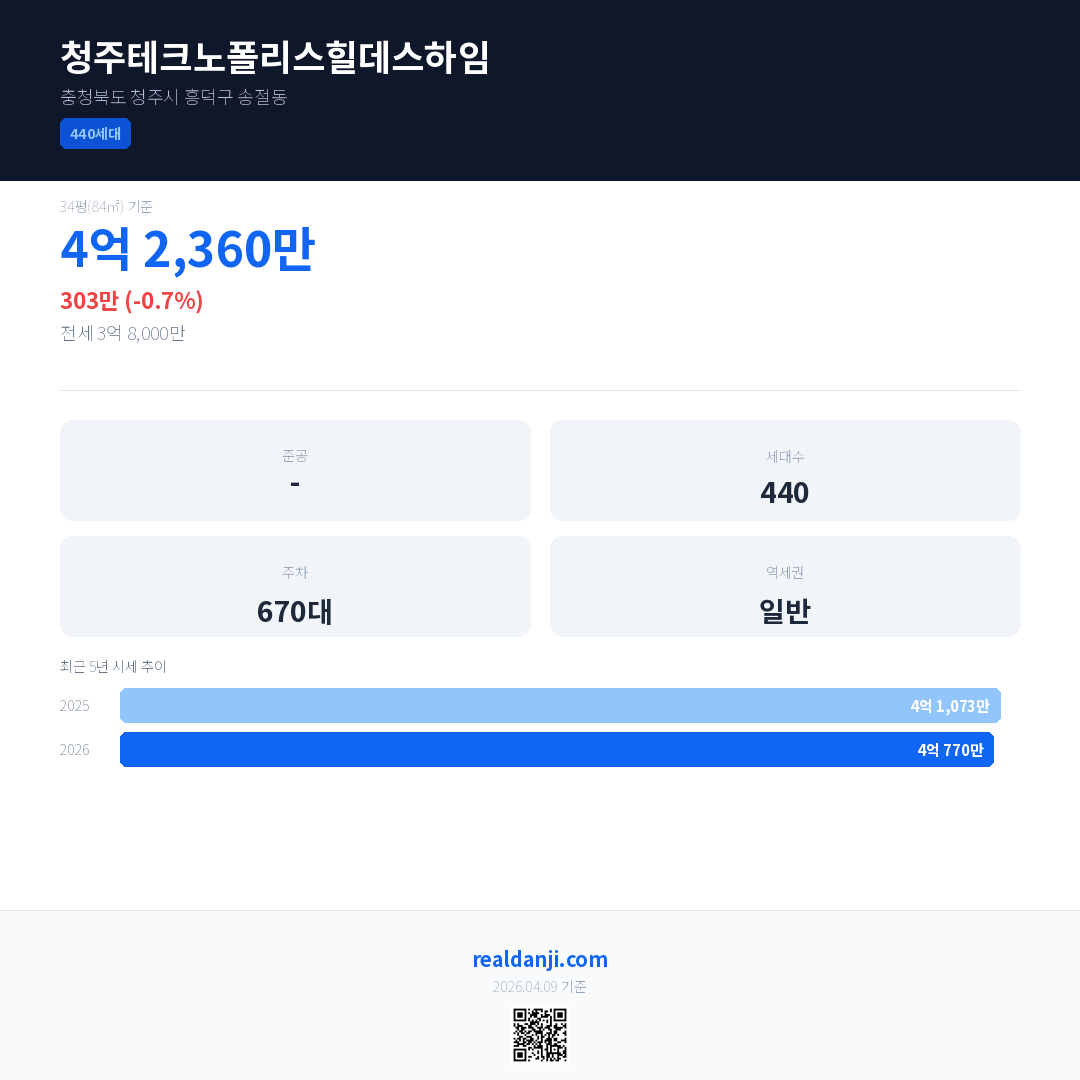 청주테크노폴리스힐데스하임 국민평형 기준 2026년 평균 거래가는 4억 770만으로, 전년 대비 0.7% 하락 했습니다.