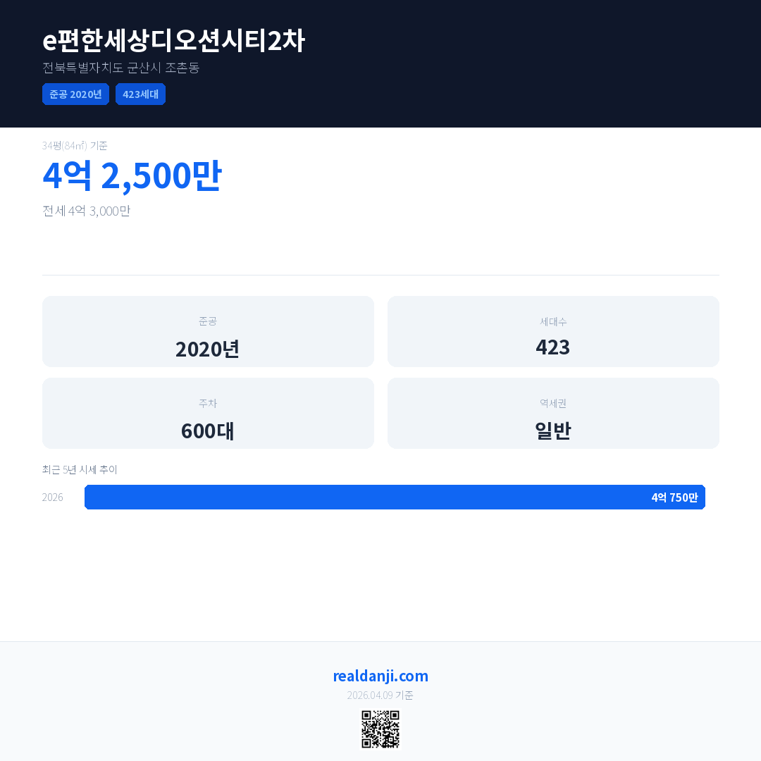 e편한세상디오션시티2차은(는) 2020년에 준공되었으며, 현재 6년차입니다. 총 423세대 규모입니다.