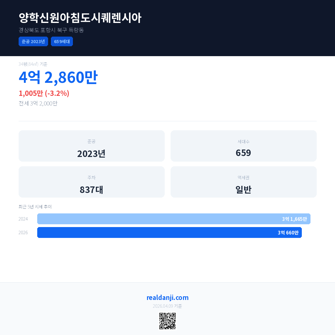 양학신원아침도시퀘렌시아 국민평형 기준 2026년 평균 거래가는 3억 660만으로, 전년 대비 3.2% 하락 했습니다.