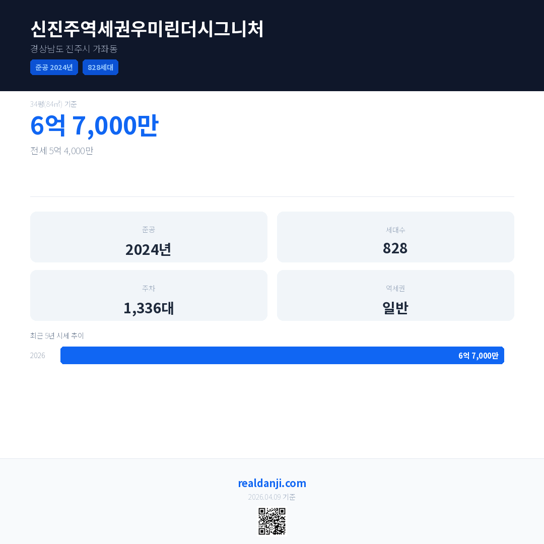 신진주역세권우미린더시그니처 최근 거래가는 6억 7,000만입니다. (2026-03)