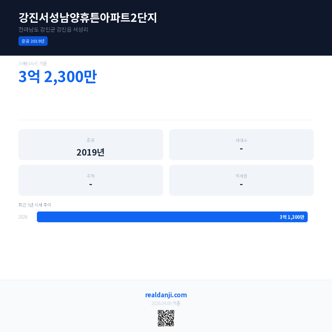 강진서성남양휴튼아파트2단지 최근 거래가는 3억 2,300만입니다. (2026-03)