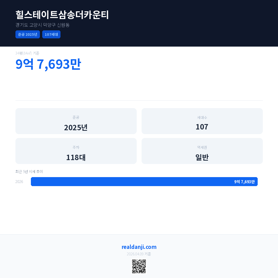 힐스테이트삼송더카운티은(는) 2025년에 준공되었으며, 현재 1년차입니다. 총 107세대 규모입니다.
