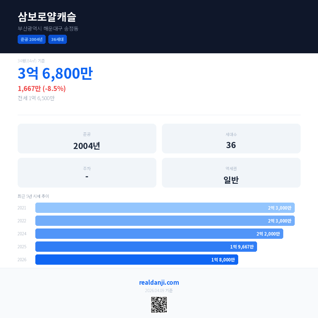 삼보로얄캐슬 최근 거래가는 3억 6,800만입니다. (2026-02)