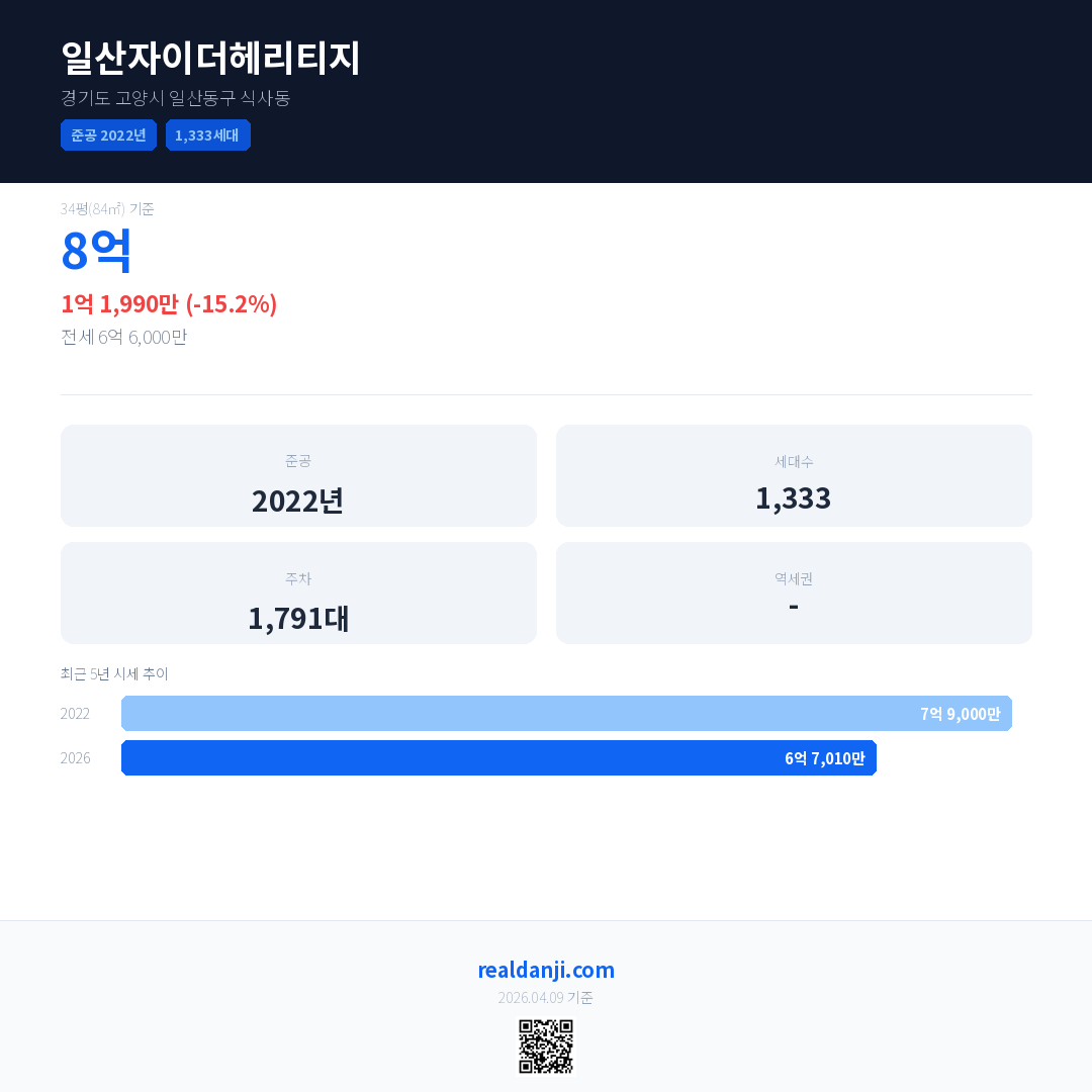 일산자이더헤리티지 최근 거래가는 8억입니다. (2026-03)