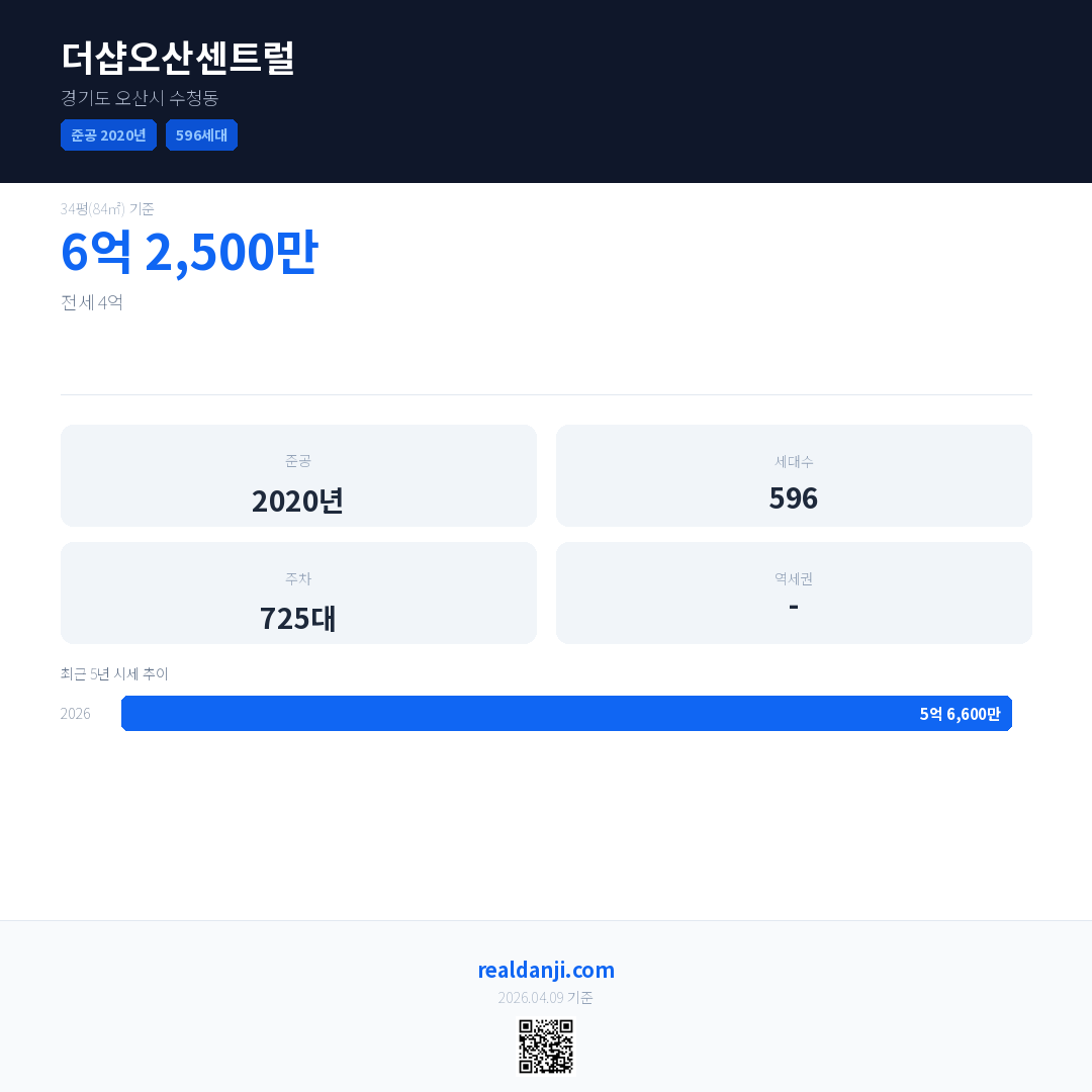 더샵오산센트럴 최근 거래가는 6억 2,500만입니다. (2026-03)