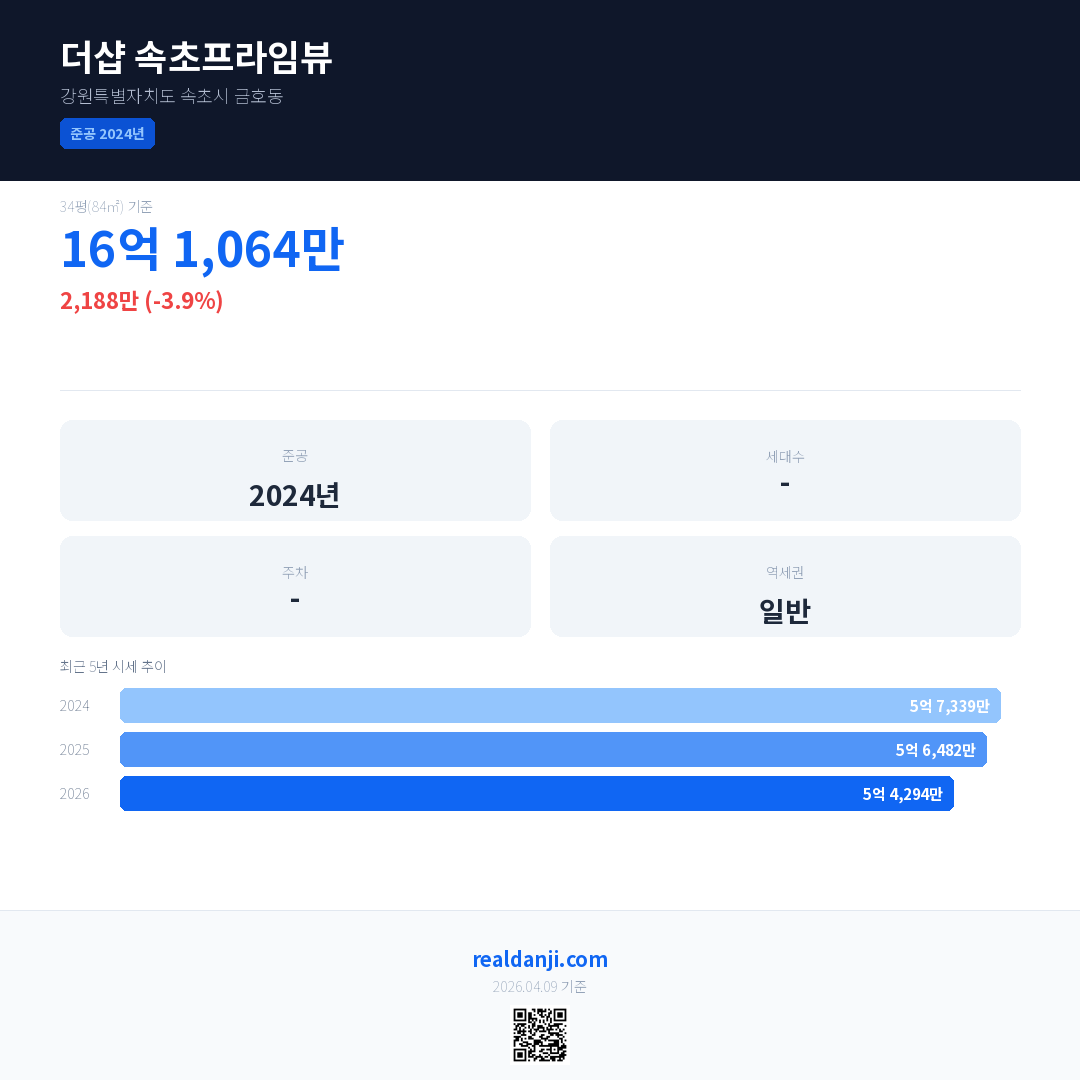 더샵 속초프라임뷰 최근 거래가는 16억 1,064만입니다. (2026-03)