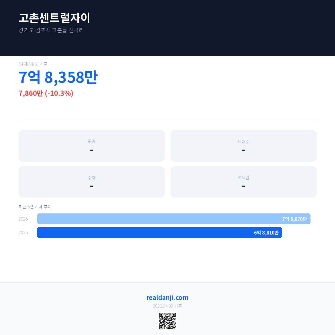 고촌센트럴자이 최근 거래가는 7억 8,358만입니다. (2026-03)