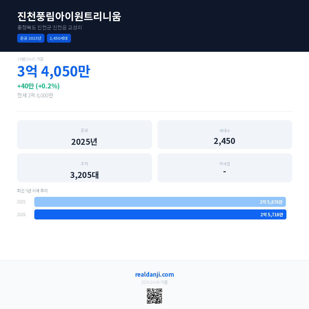 진천풍림아이원트리니움 국민평형 기준 2026년 평균 거래가는 2억 5,716만으로, 전년 대비 0.2% 상승 했습니다.