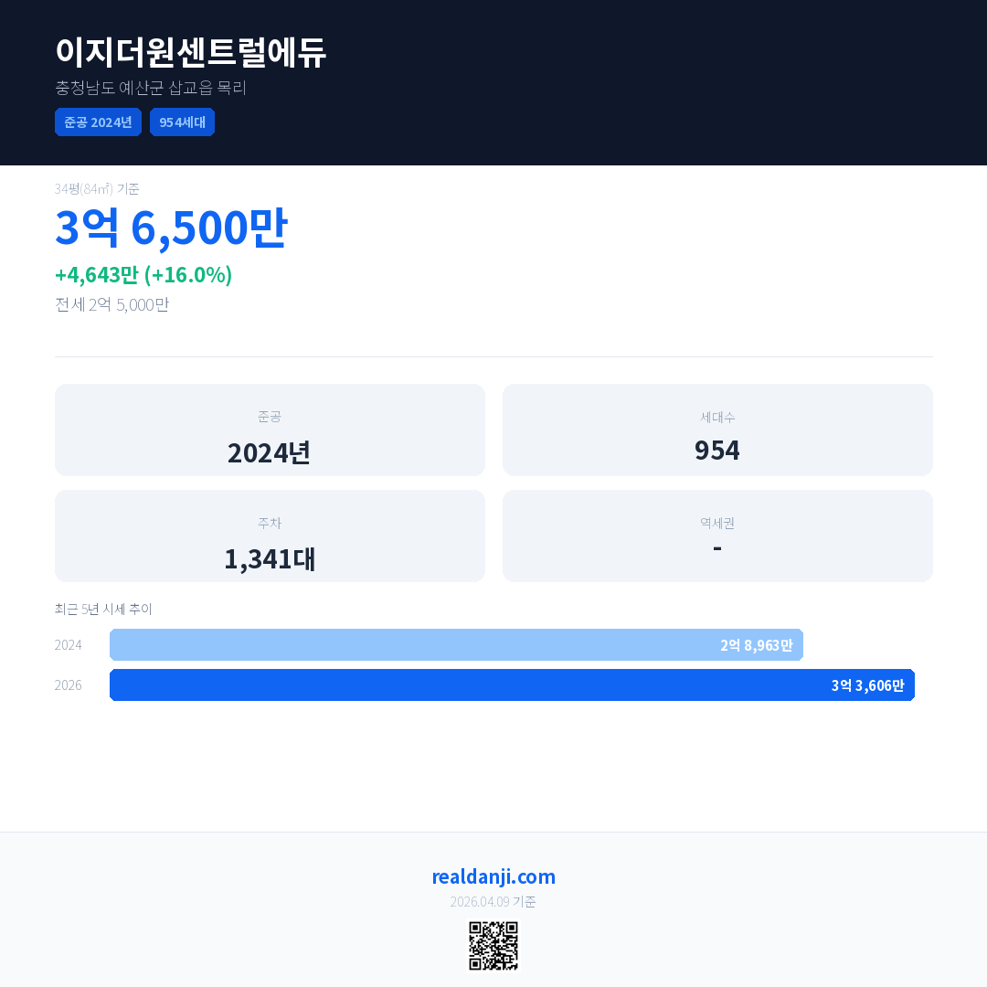 이지더원센트럴에듀 국민평형 기준 2026년 평균 거래가는 3억 3,606만으로, 전년 대비 16.0% 상승 했습니다.