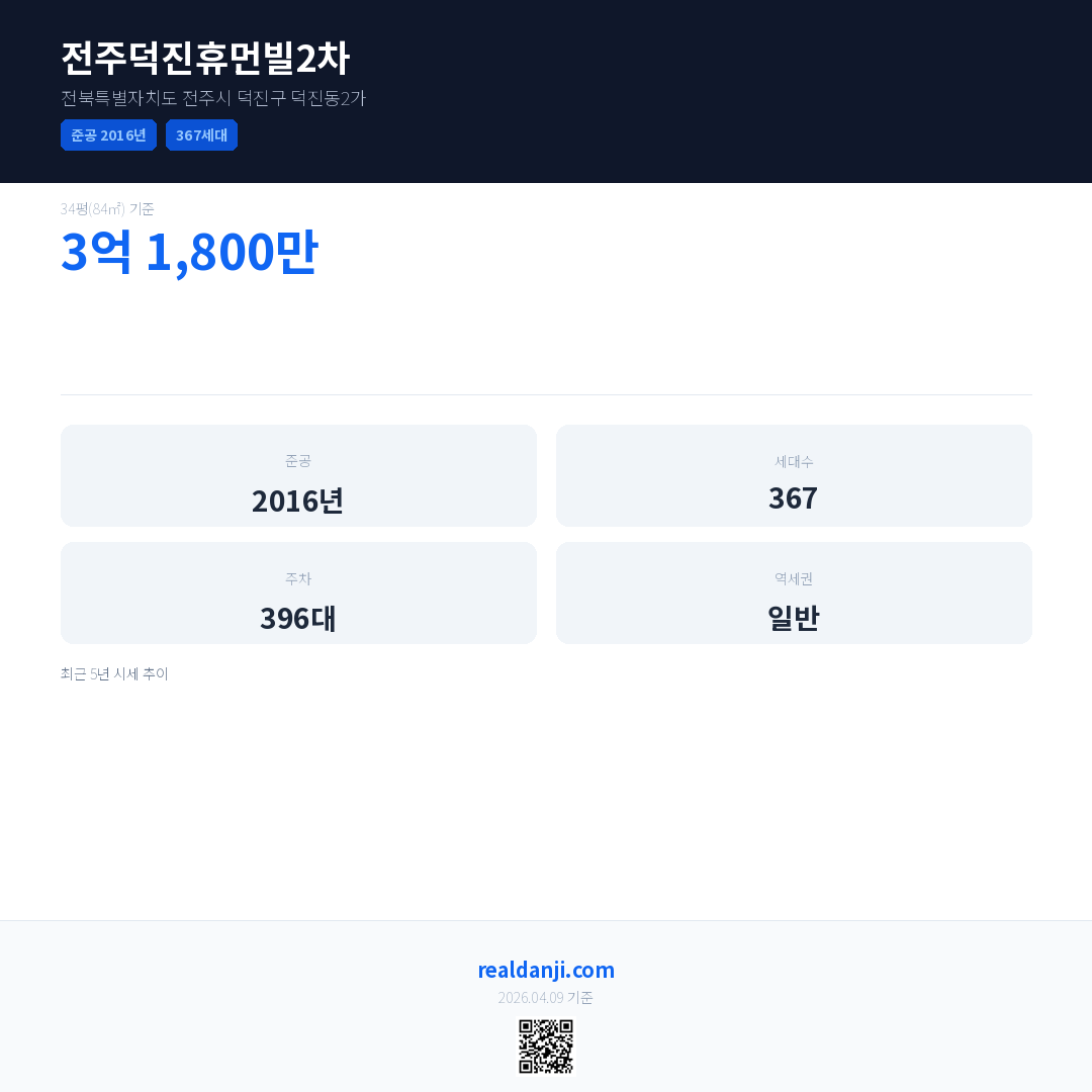 전주덕진휴먼빌2차은(는) 2016년에 준공되었으며, 현재 10년차입니다. 총 367세대 규모입니다.