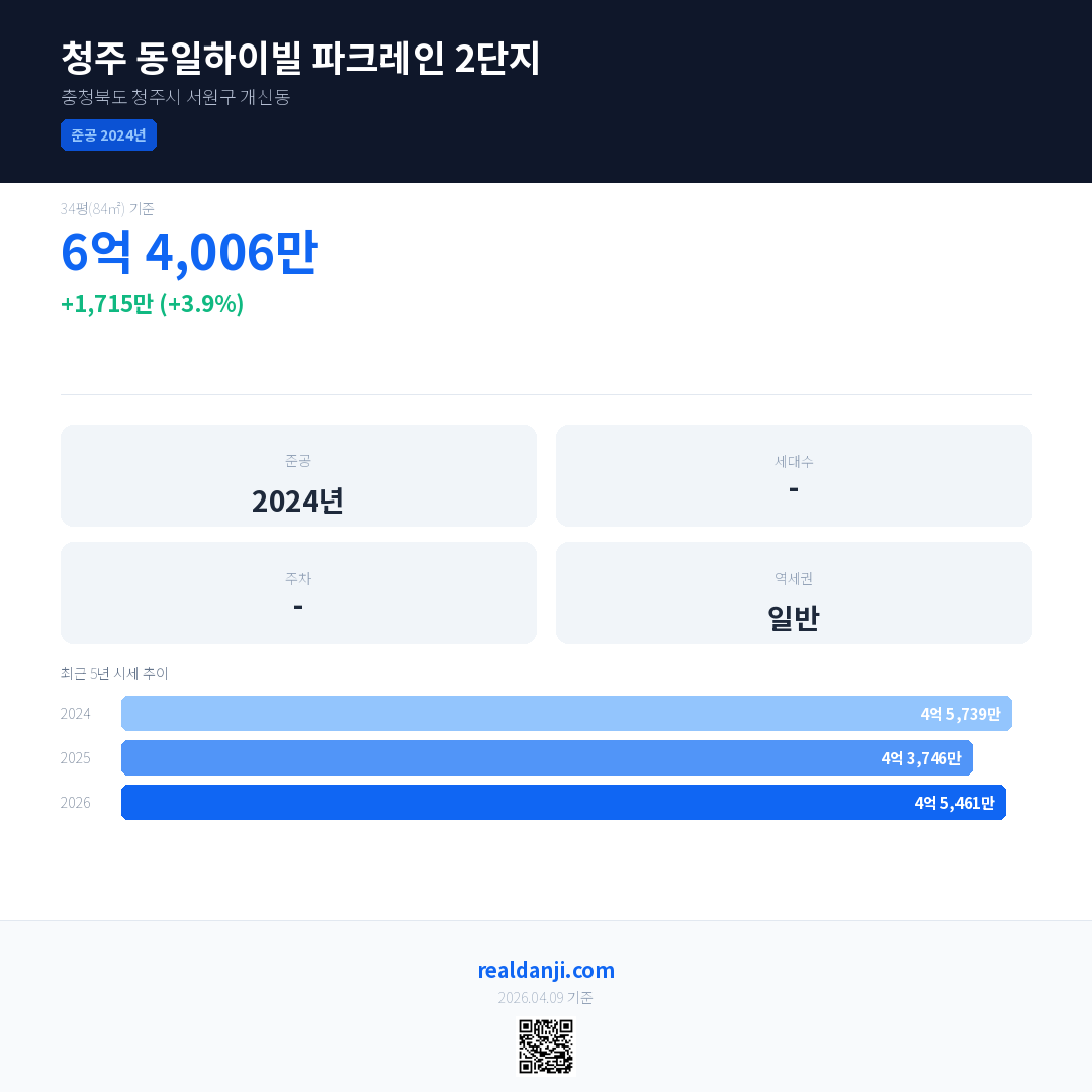 청주 동일하이빌 파크레인 2단지 국민평형 기준 2026년 평균 거래가는 4억 5,461만으로, 전년 대비 3.9% 상승 했습니다.