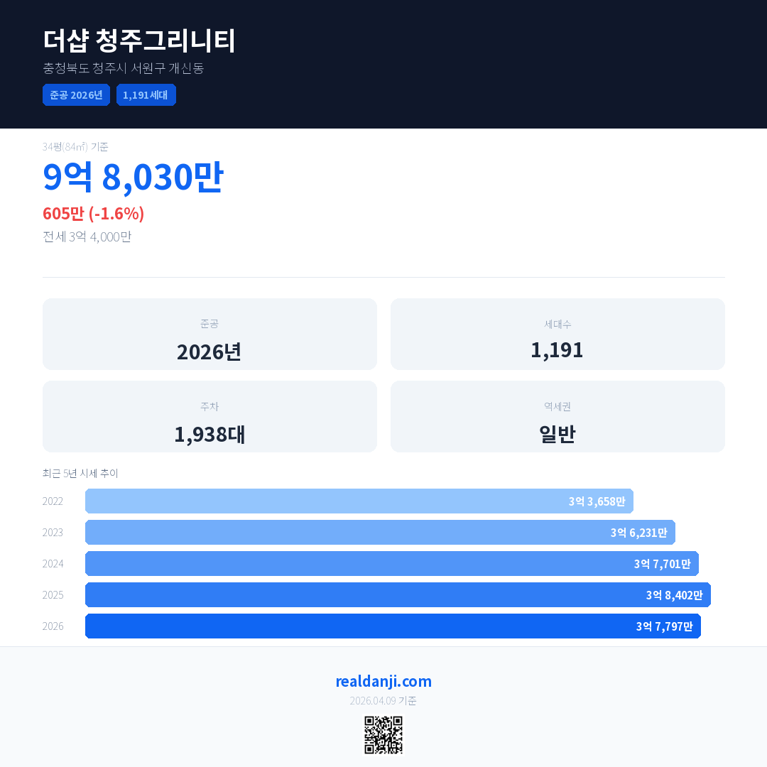 더샵 청주그리니티은(는) 2026년에 준공되었으며, 현재 0년차입니다. 총 1,191세대 규모입니다.