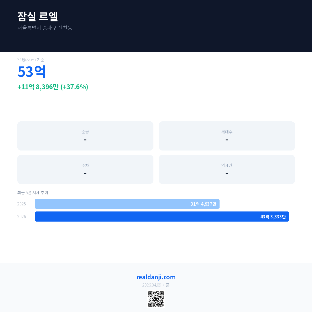 잠실 르엘 국민평형 기준 2026년 평균 거래가는 43억 3,333만으로, 전년 대비 37.6% 상승 했습니다.