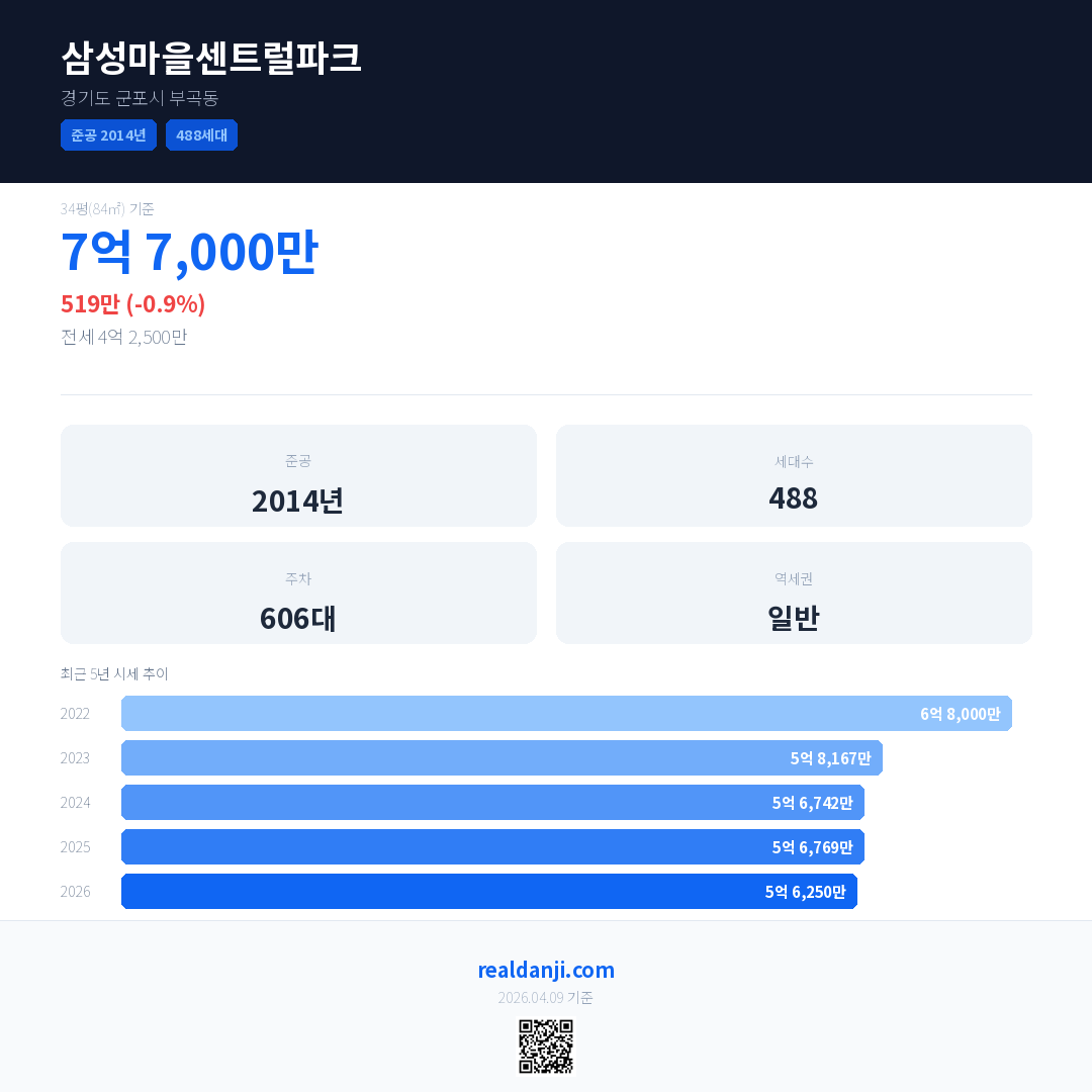 삼성마을센트럴파크 최근 거래가는 7억 7,000만입니다. (2026-03)
