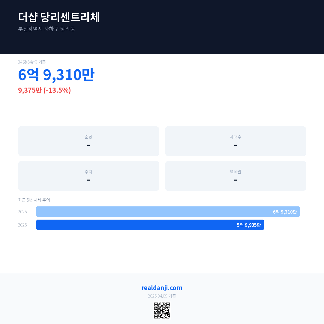 더샵 당리센트리체 국민평형 기준 2026년 평균 거래가는 5억 9,935만으로, 전년 대비 13.5% 하락 했습니다.