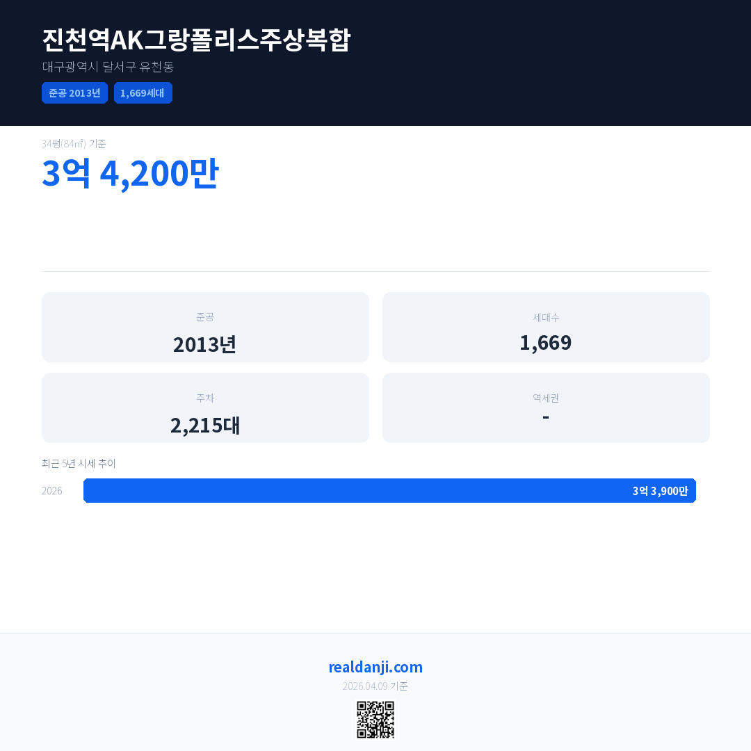 진천역AK그랑폴리스주상복합은(는) 2013년에 준공되었으며, 현재 13년차입니다. 총 1,669세대 규모입니다.