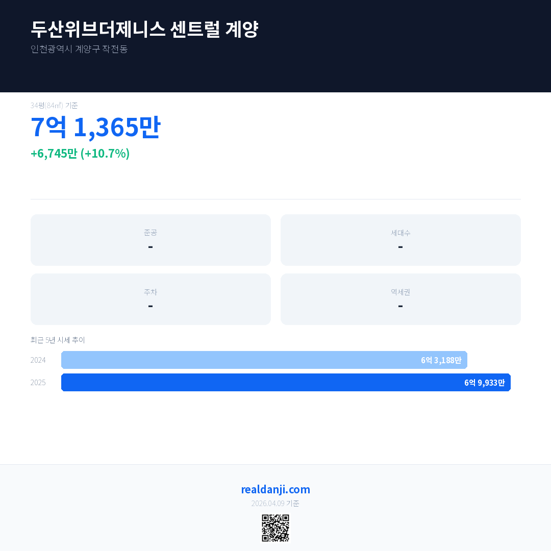 두산위브더제니스 센트럴 계양 국민평형 기준 2025년 평균 거래가는 6억 9,933만으로, 전년 대비 10.7% 상승 했습니다.