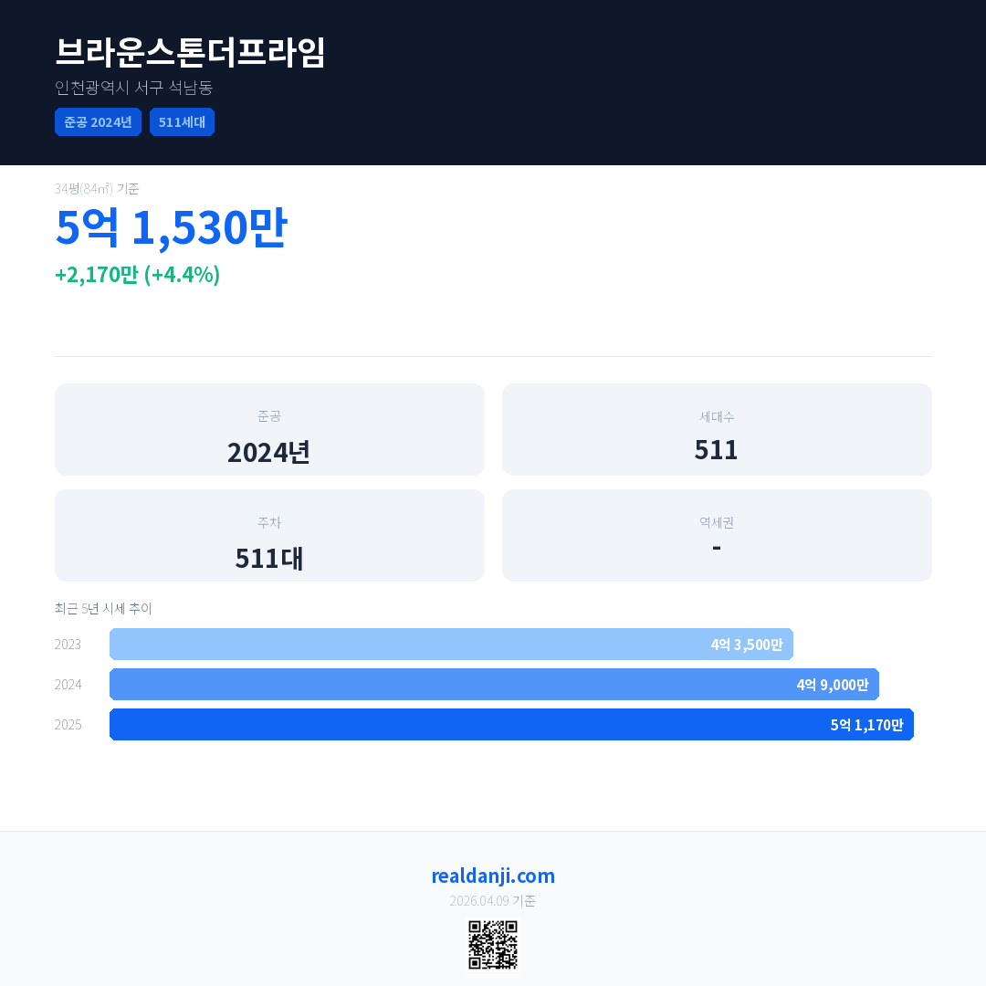 브라운스톤더프라임 국민평형 기준 2025년 평균 거래가는 5억 1,170만으로, 전년 대비 4.4% 상승 했습니다.