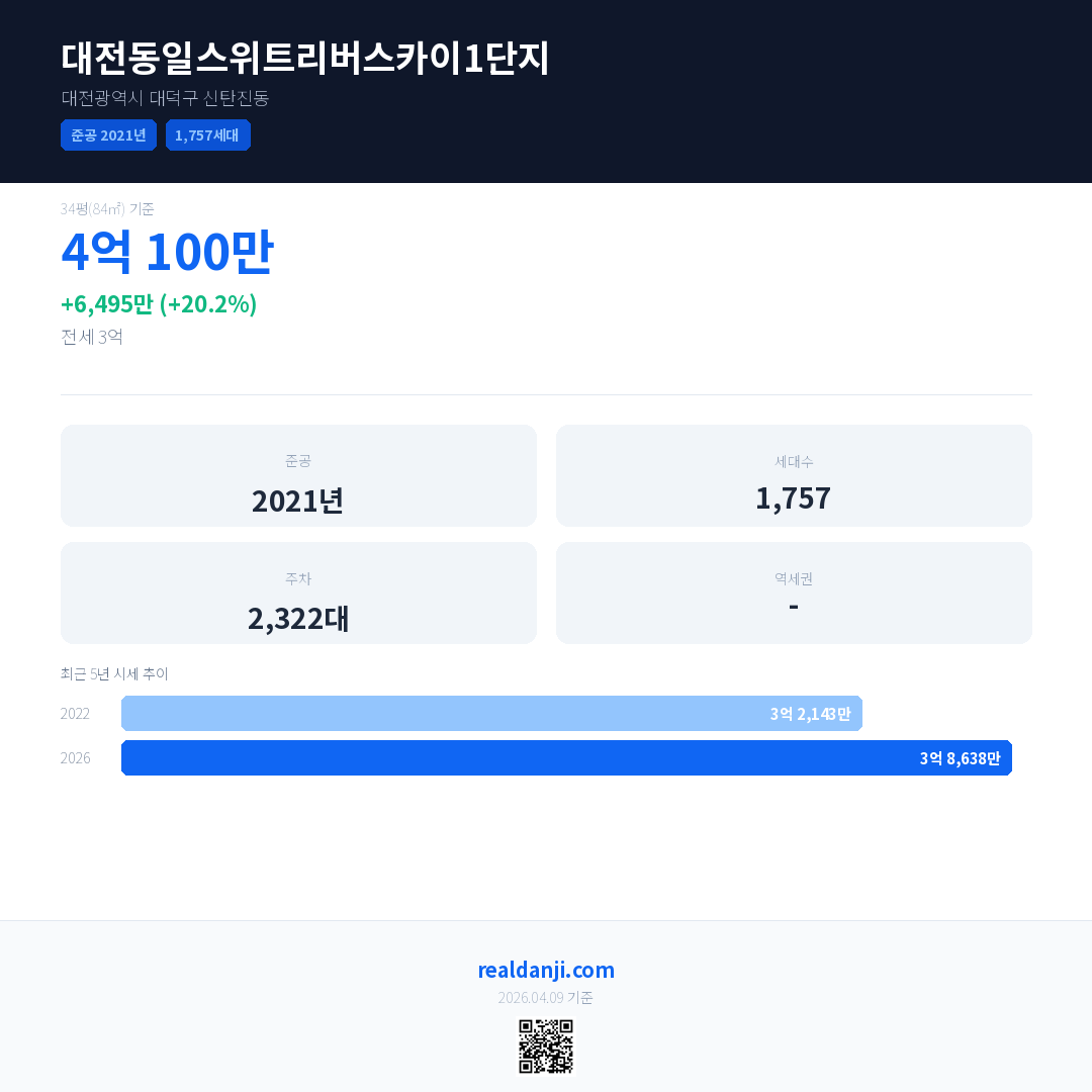 대전동일스위트리버스카이1단지 국민평형 기준 2026년 평균 거래가는 3억 8,638만으로, 전년 대비 20.2% 상승 했습니다.