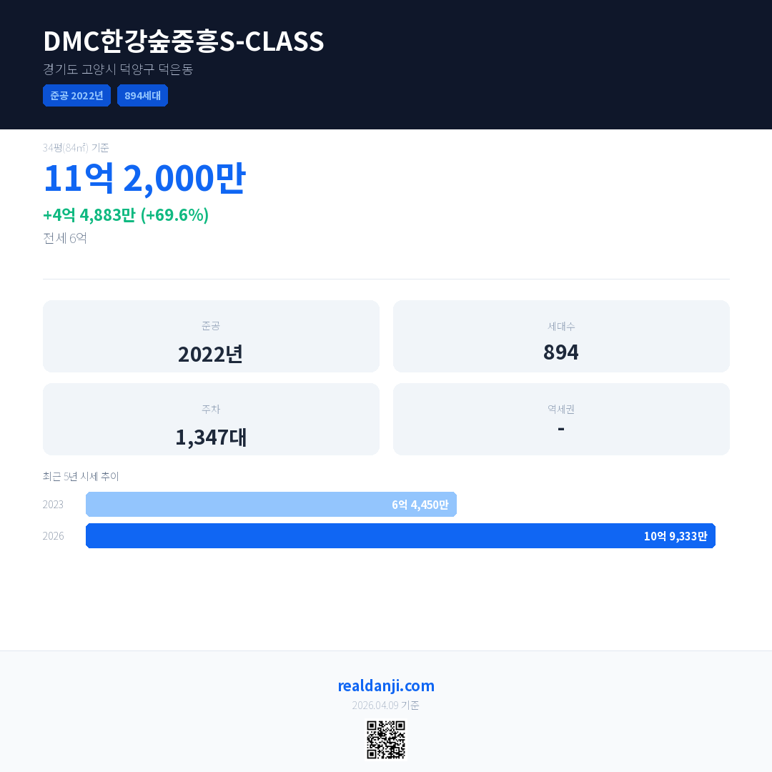 DMC한강숲중흥S-CLASS 국민평형 기준 2026년 평균 거래가는 10억 9,333만으로, 전년 대비 69.6% 상승 했습니다.