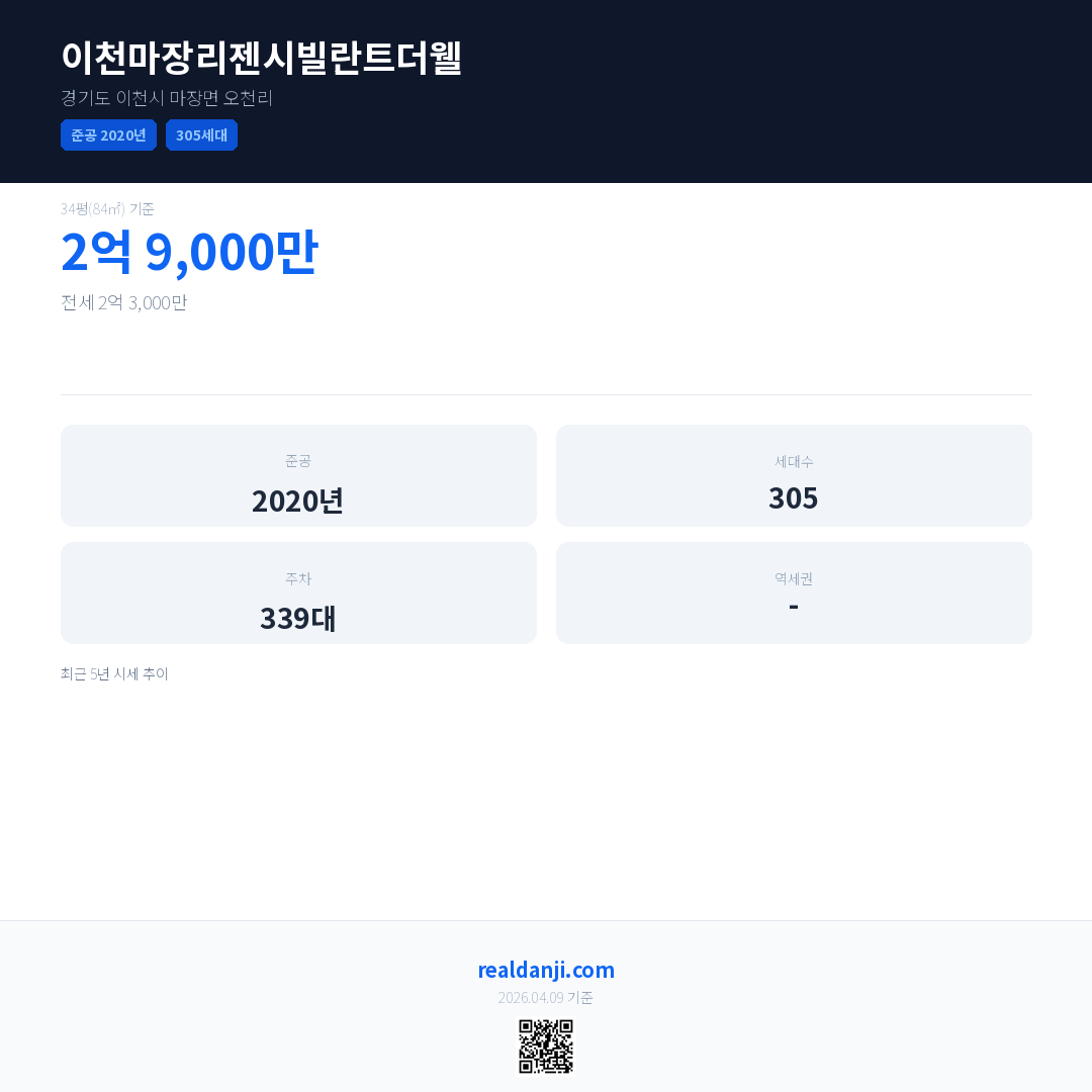 이천마장리젠시빌란트더웰은(는) 2020년에 준공되었으며, 현재 6년차입니다. 총 305세대 규모입니다.