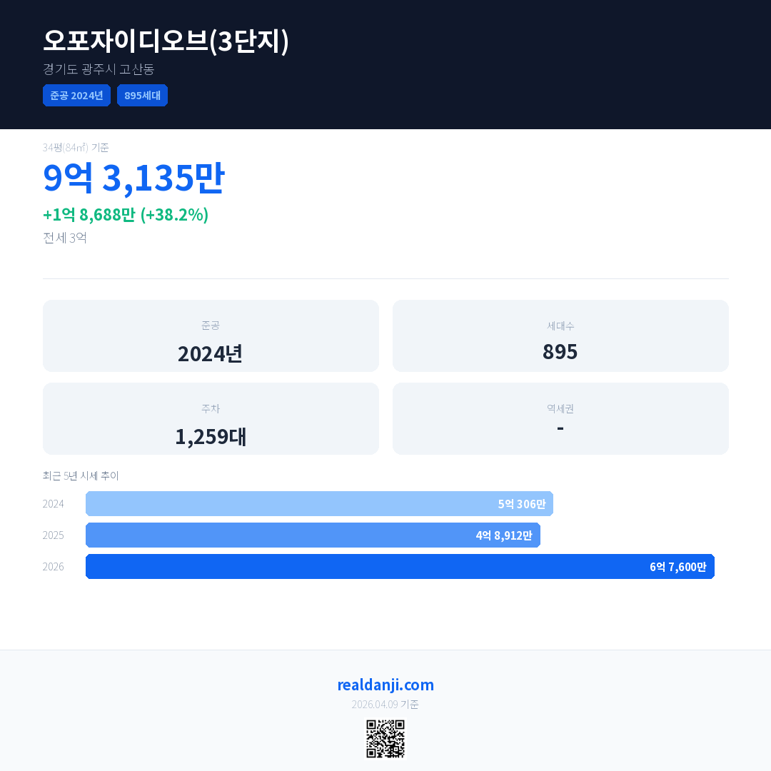 오포자이디오브(3단지) 국민평형 기준 2026년 평균 거래가는 6억 7,600만으로, 전년 대비 38.2% 상승 했습니다.