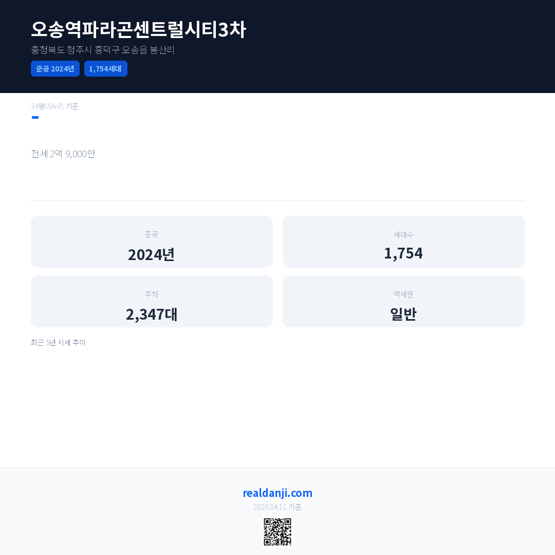 오송역파라곤센트럴시티3차은(는) 2024년에 준공되었으며, 현재 2년차입니다. 총 1,754세대 규모입니다.