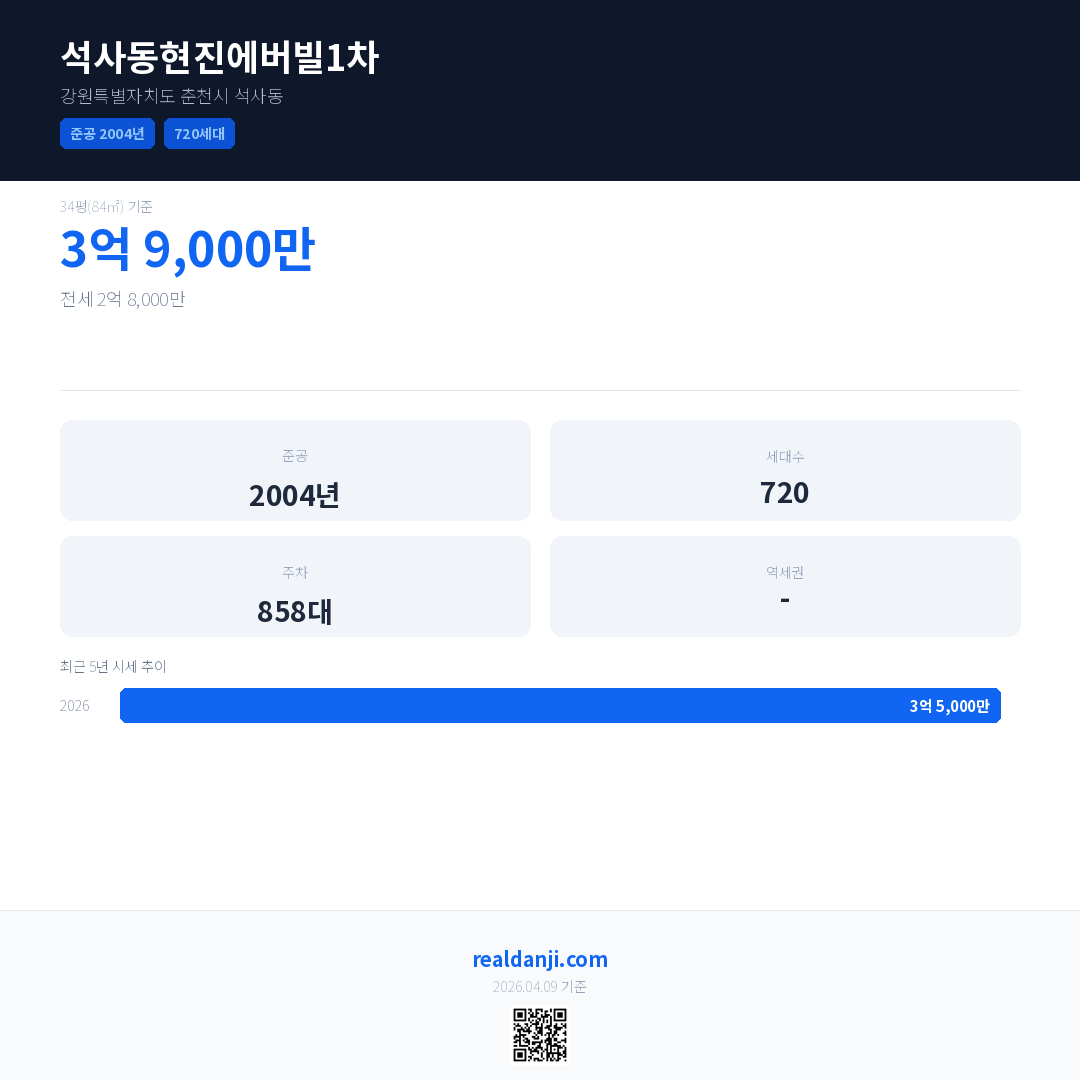 석사동현진에버빌1차 최근 거래가는 3억 9,000만입니다. (2026-03)