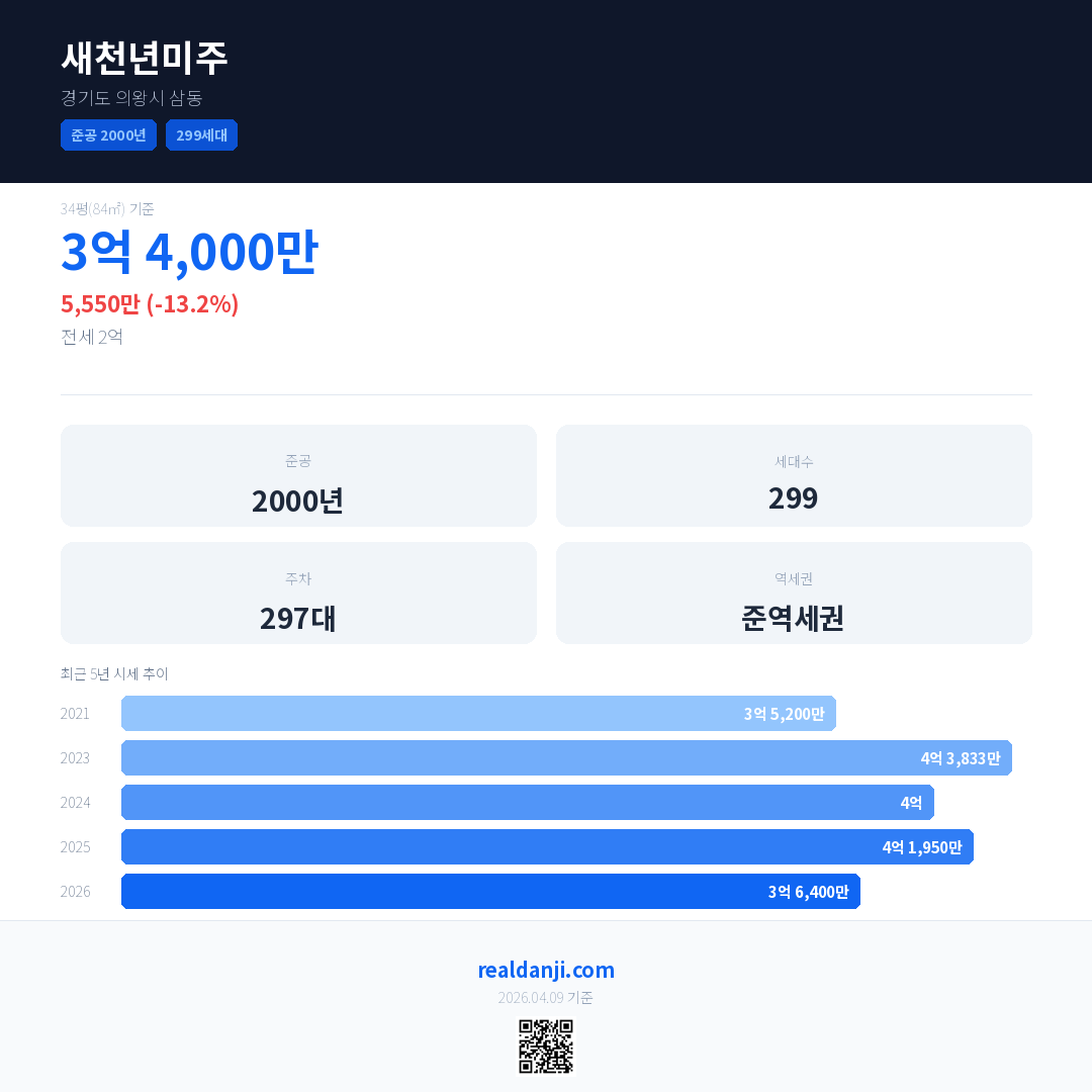 새천년미주 국민평형 기준 2026년 평균 거래가는 3억 6,400만으로, 전년 대비 13.2% 하락 했습니다.