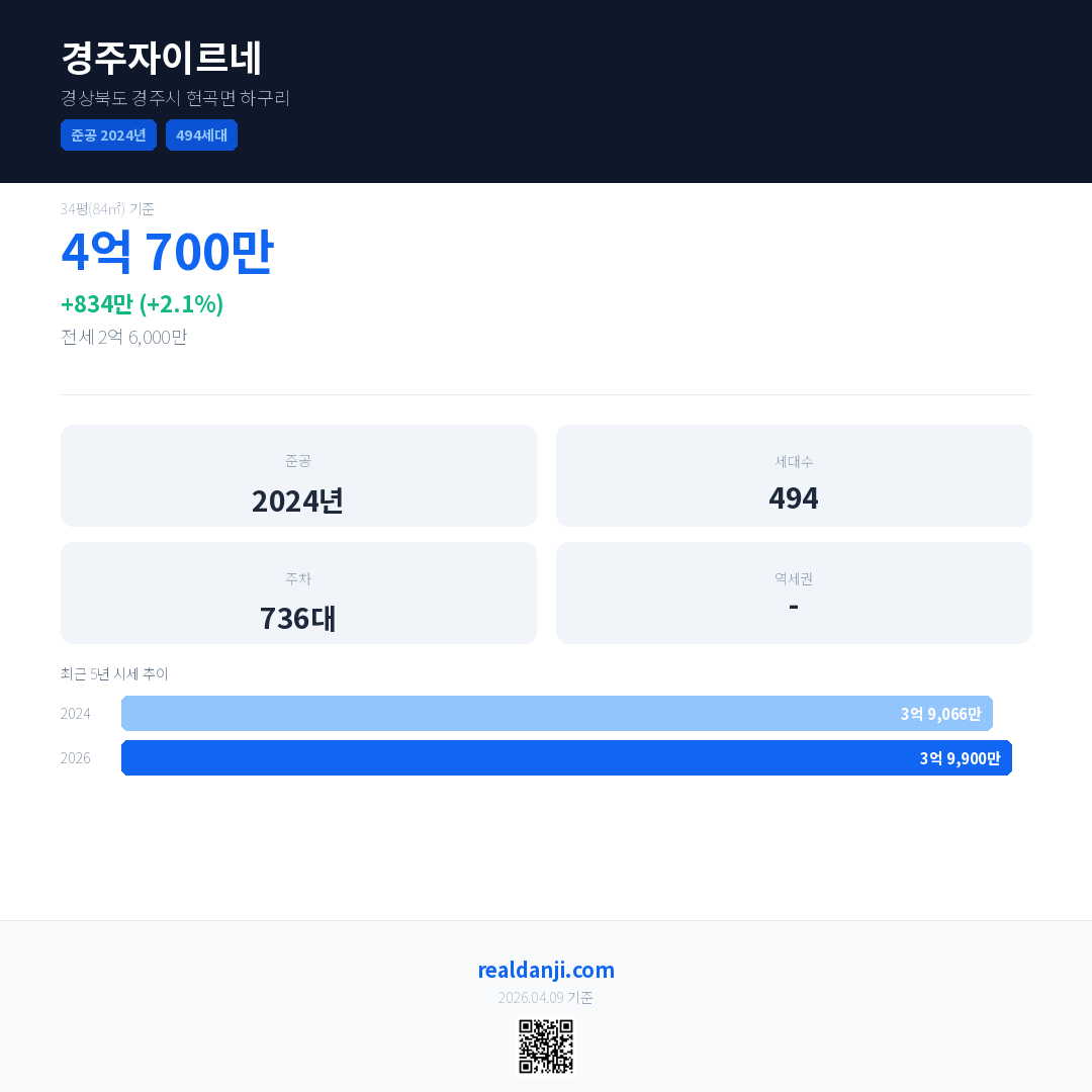 경주자이르네 국민평형 기준 2026년 평균 거래가는 3억 9,900만으로, 전년 대비 2.1% 상승 했습니다.