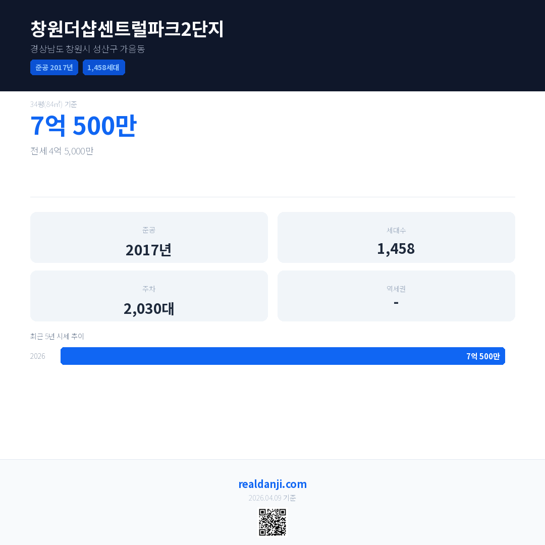 창원더샵센트럴파크2단지 최근 거래가는 7억 500만입니다. (2026-03)