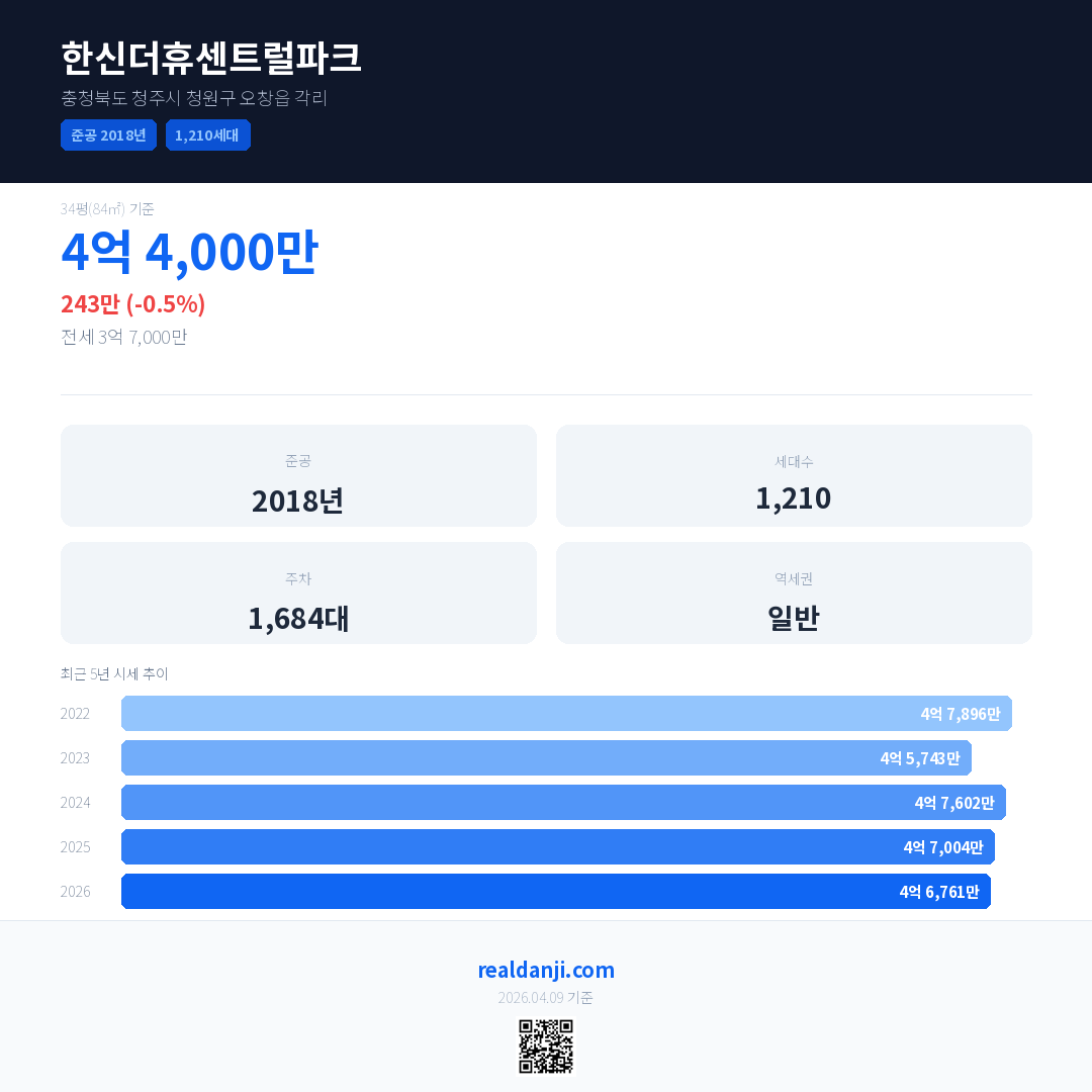 한신더휴센트럴파크 국민평형 기준 2026년 평균 거래가는 4억 6,761만으로, 전년 대비 0.5% 하락 했습니다.