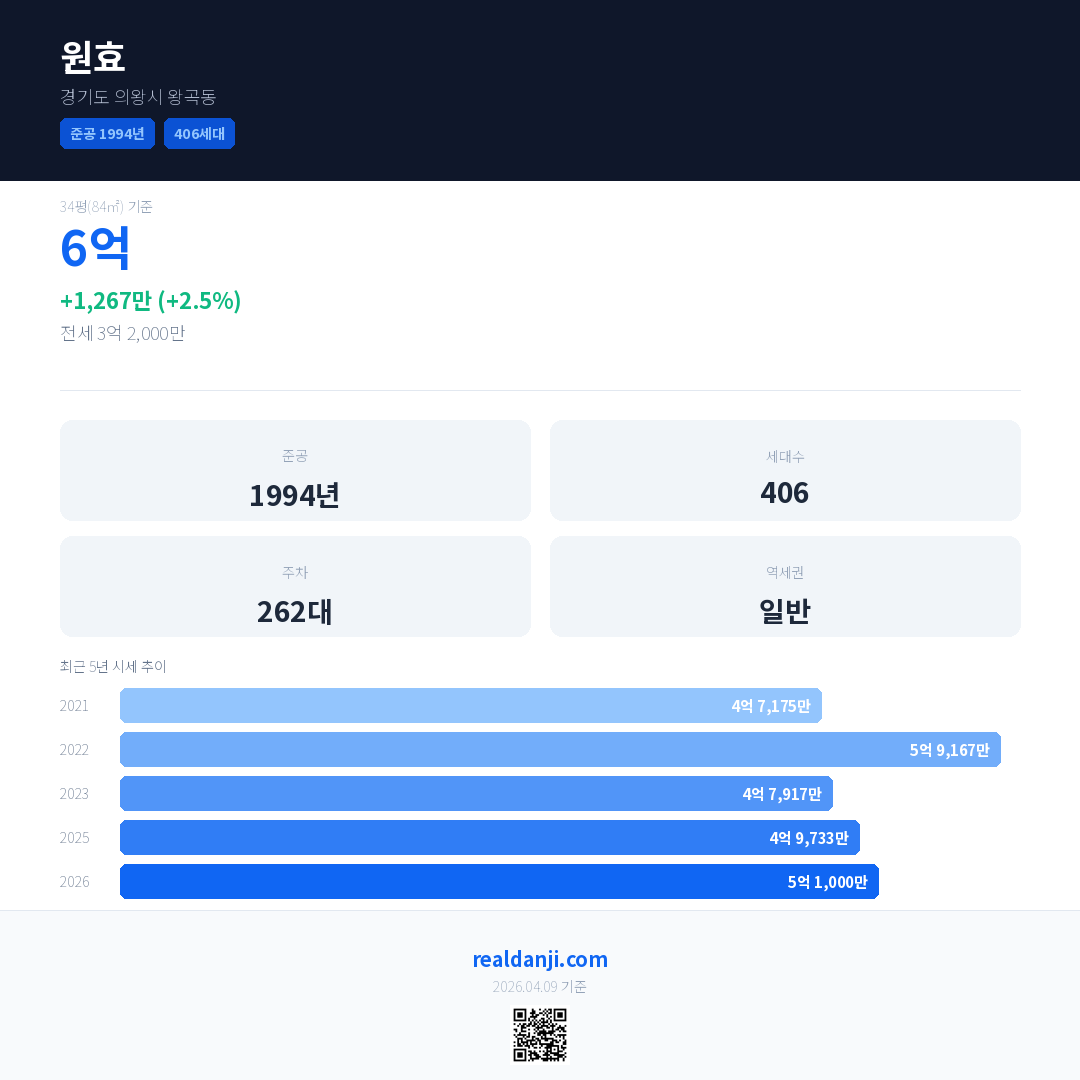 원효 국민평형 기준 2026년 평균 거래가는 5억 1,000만으로, 전년 대비 2.5% 상승 했습니다.