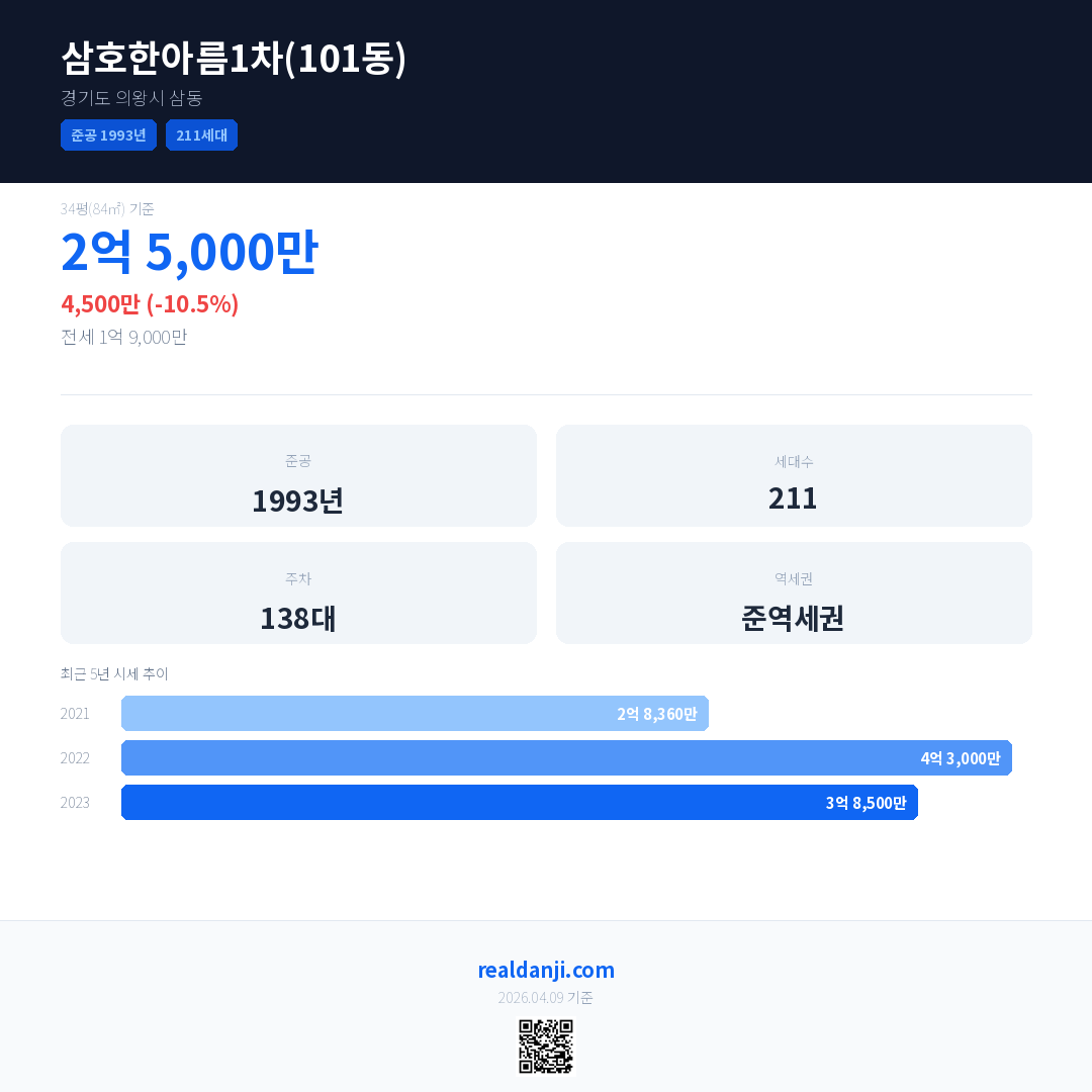 삼호한아름1차(101동)은(는) 1993년에 준공되었으며, 현재 33년차입니다. 총 211세대 규모입니다.