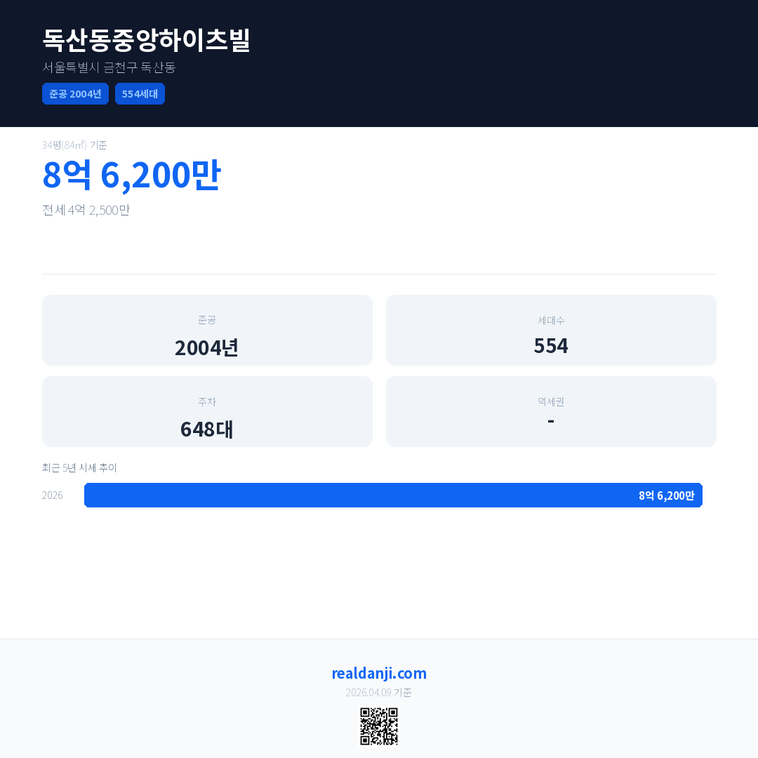 독산동중앙하이츠빌 최근 거래가는 8억 6,200만입니다. (2026-03)