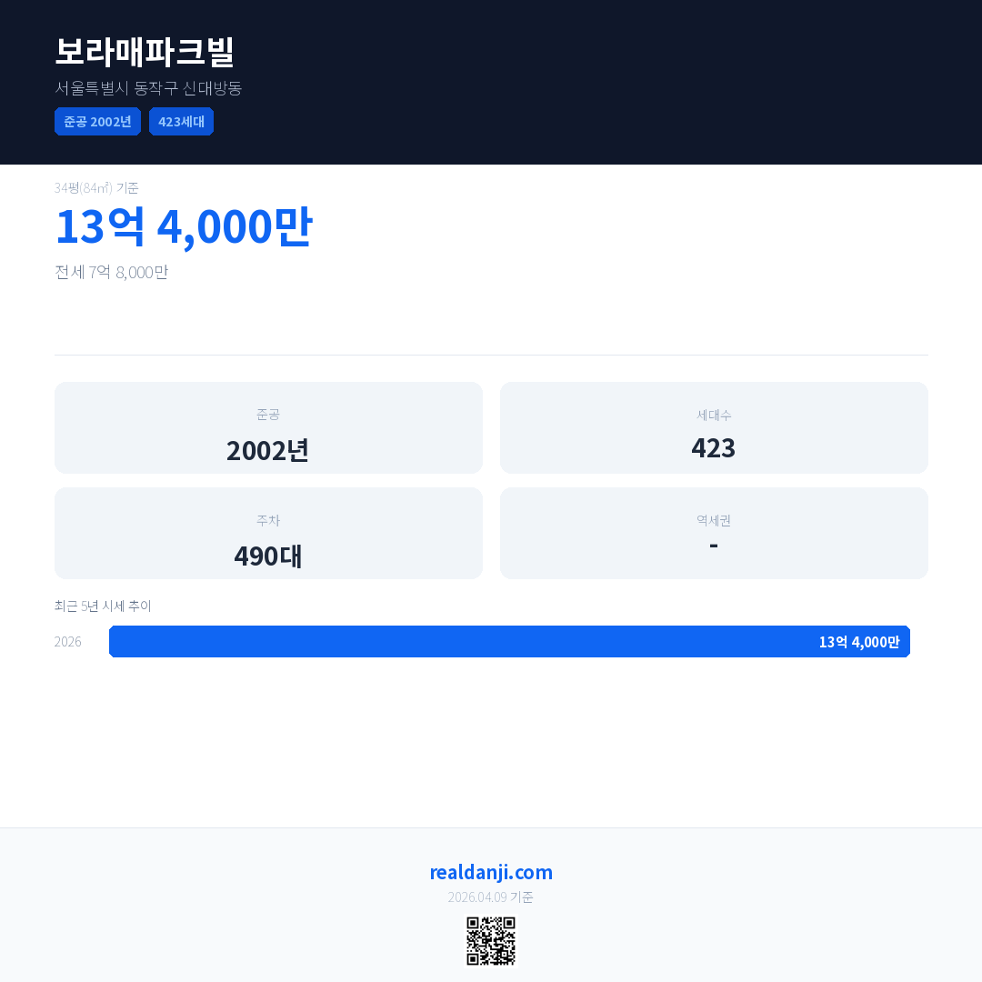 보라매파크빌 최근 거래가는 13억 4,000만입니다. (2026-04)