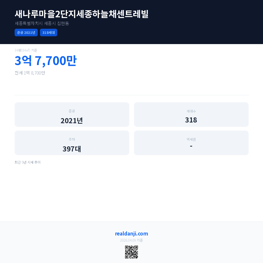 새나루마을2단지세종하늘채센트레빌 최근 거래가는 3억 7,700만입니다. (2026-03)