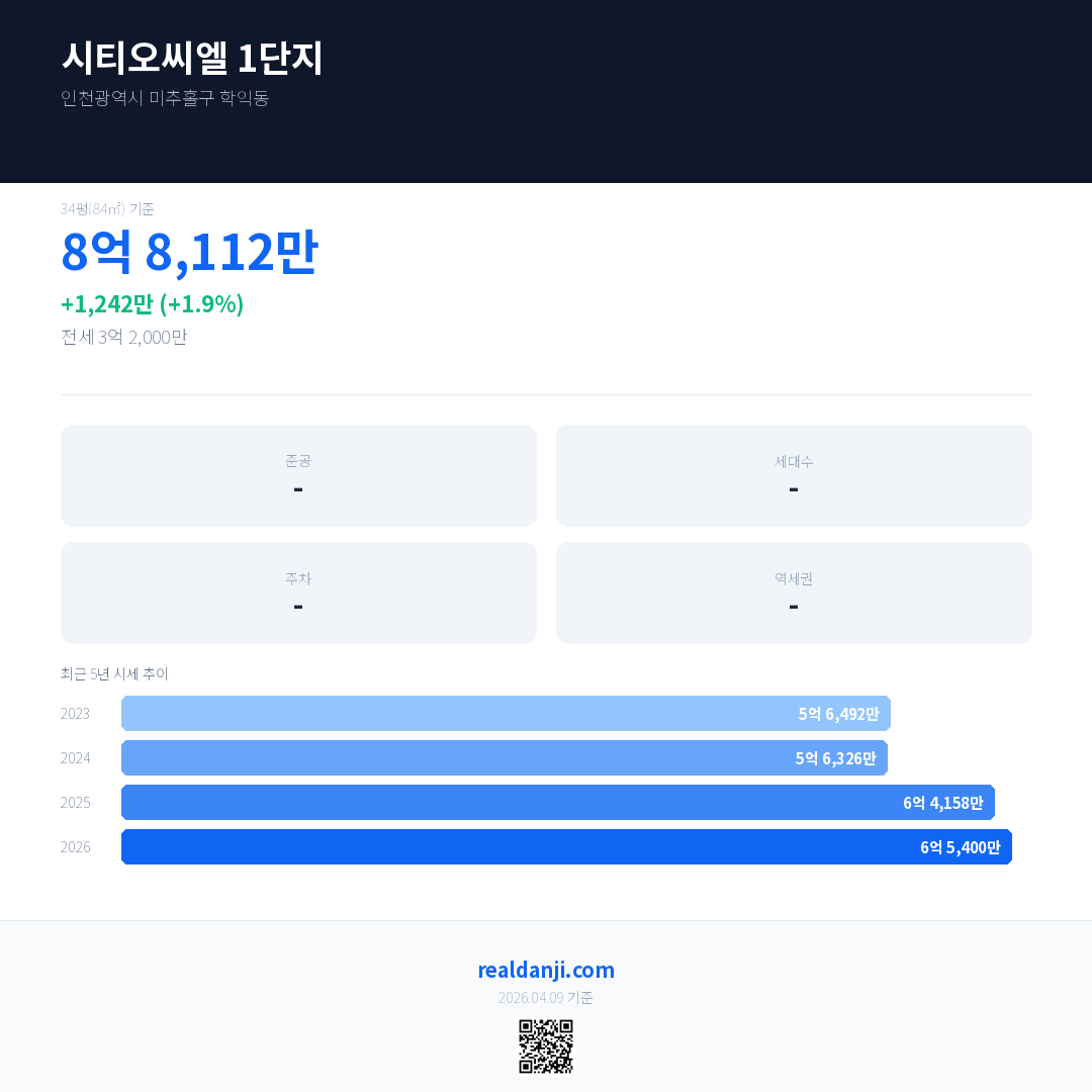 시티오씨엘 1단지 국민평형 기준 2026년 평균 거래가는 6억 5,400만으로, 전년 대비 1.9% 상승 했습니다.