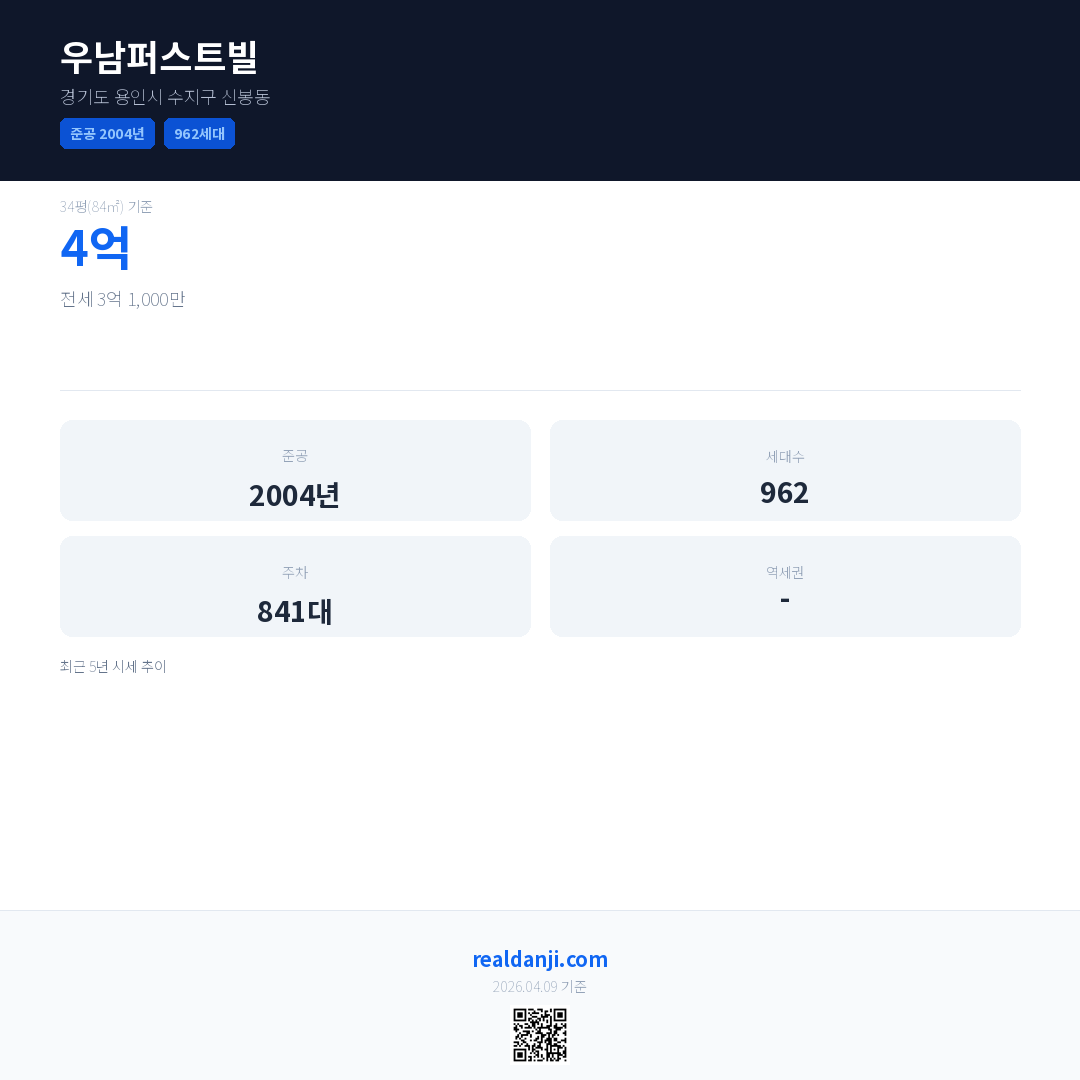 우남퍼스트빌은(는) 2004년에 준공되었으며, 현재 22년차입니다. 총 962세대 규모입니다.
