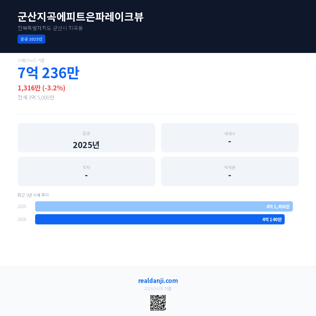 군산지곡에피트은파레이크뷰 최근 거래가는 4억 258만입니다. (2026-03)