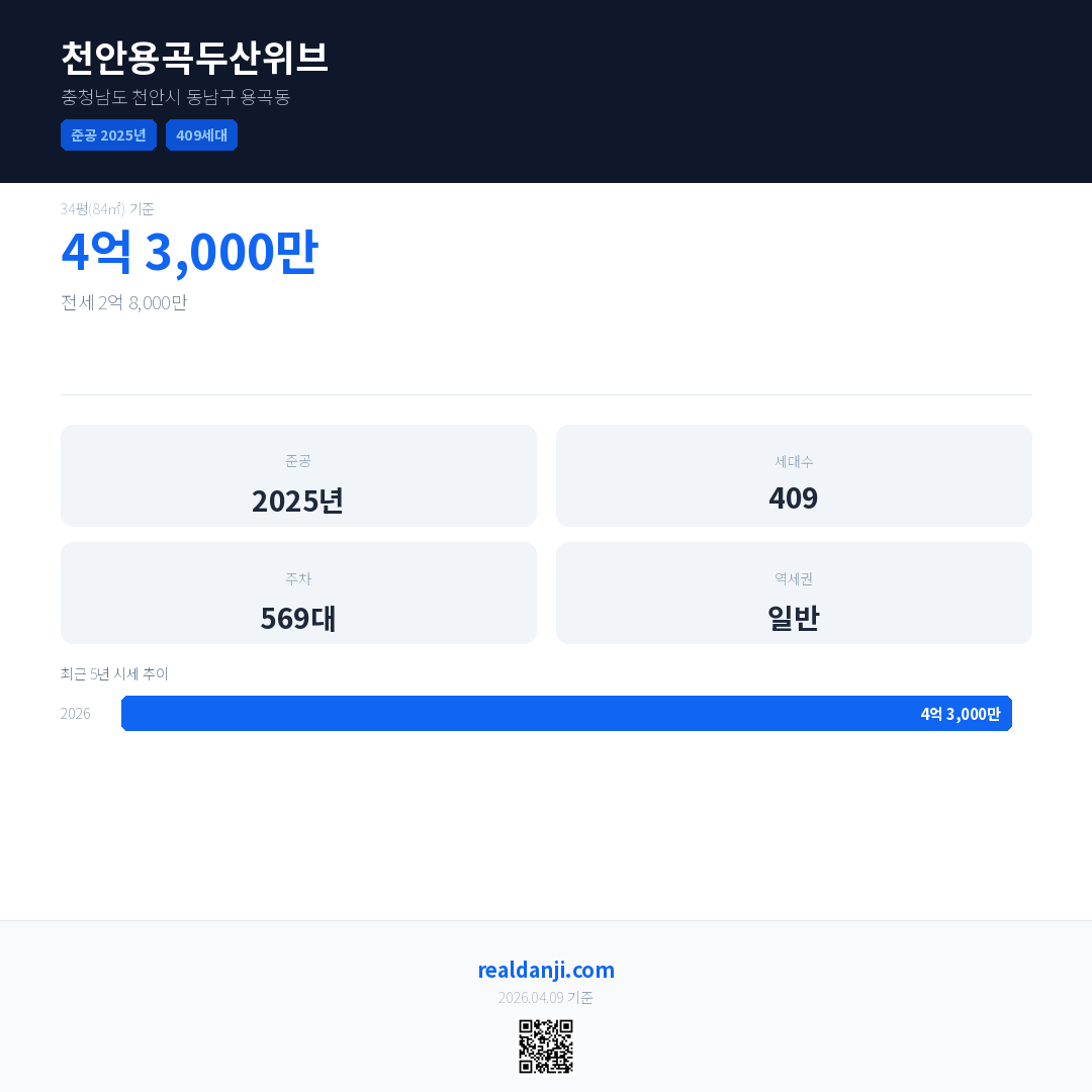 천안용곡두산위브 최근 거래가는 4억 3,000만입니다. (2026-03)