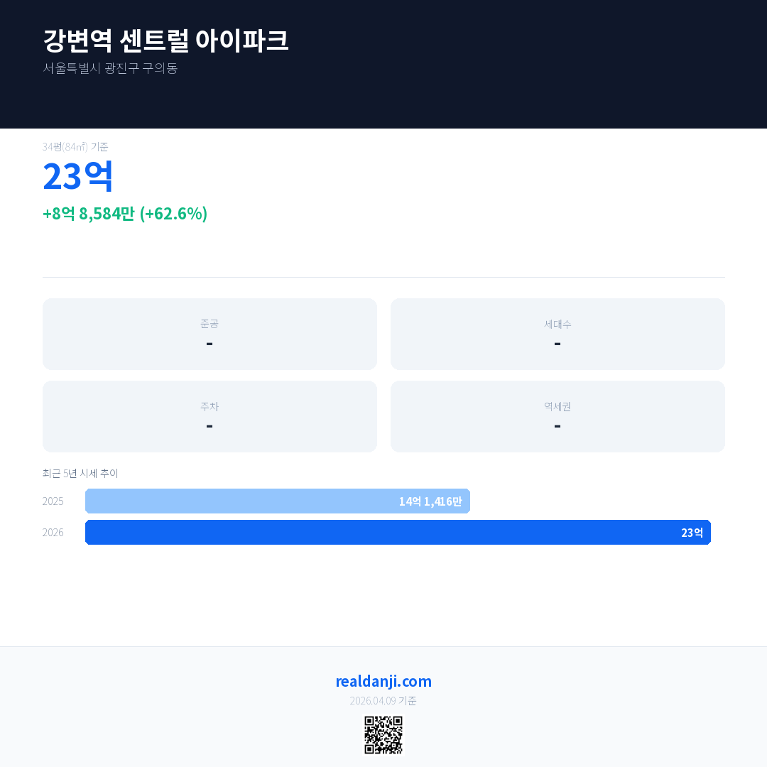 강변역 센트럴 아이파크 국민평형 기준 2026년 평균 거래가는 23억으로, 전년 대비 62.6% 상승 했습니다.