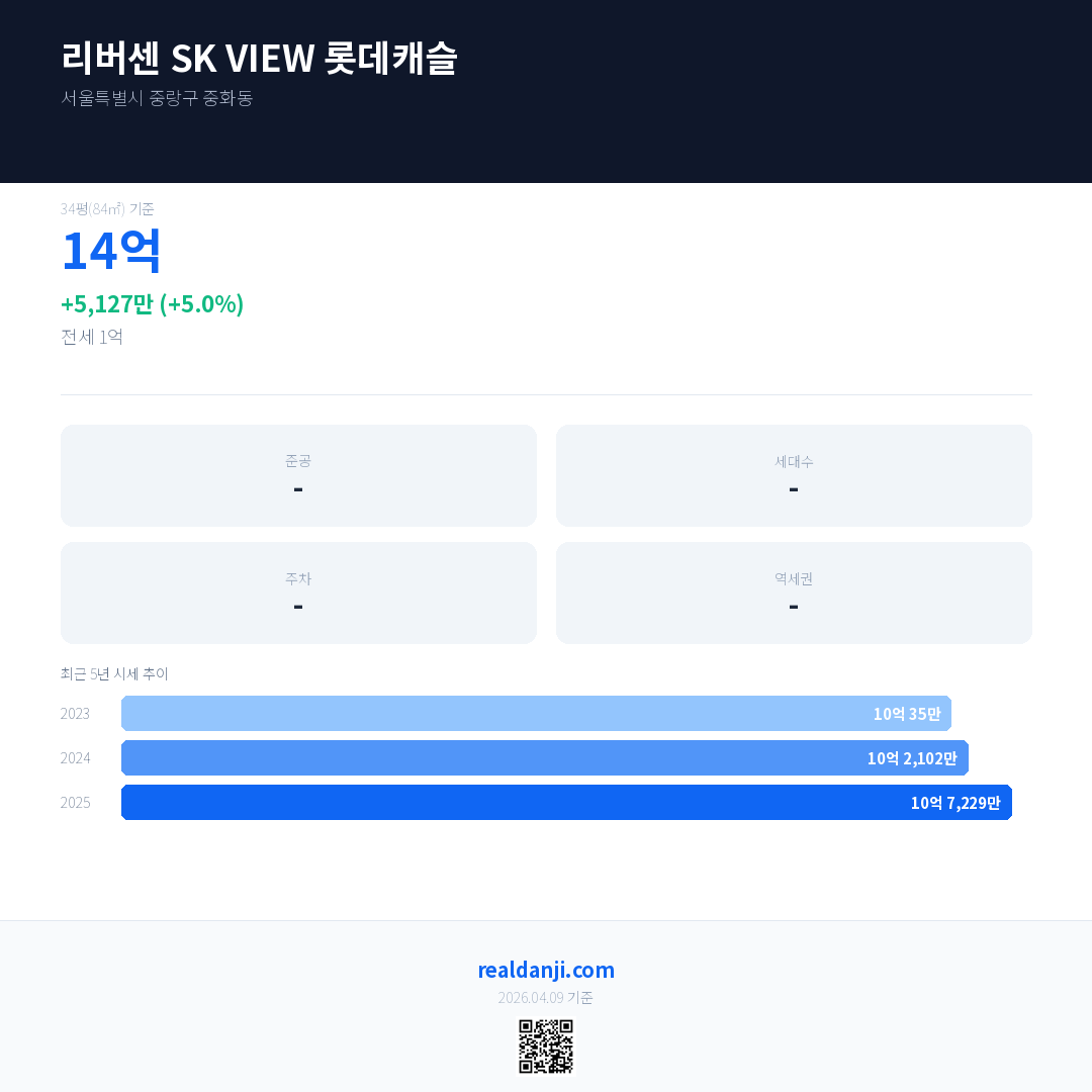 리버센 SK VIEW 롯데캐슬 국민평형 기준 2025년 평균 거래가는 10억 7,229만으로, 전년 대비 5.0% 상승 했습니다.