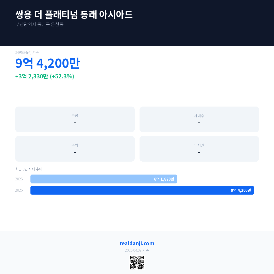 쌍용 더 플래티넘 동래 아시아드 국민평형 기준 2026년 평균 거래가는 9억 4,200만으로, 전년 대비 52.3% 상승 했습니다.