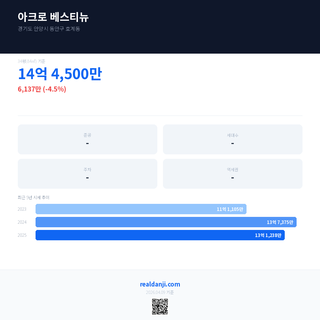 아크로 베스티뉴 국민평형 기준 2025년 평균 거래가는 13억 1,238만으로, 전년 대비 4.5% 하락 했습니다.