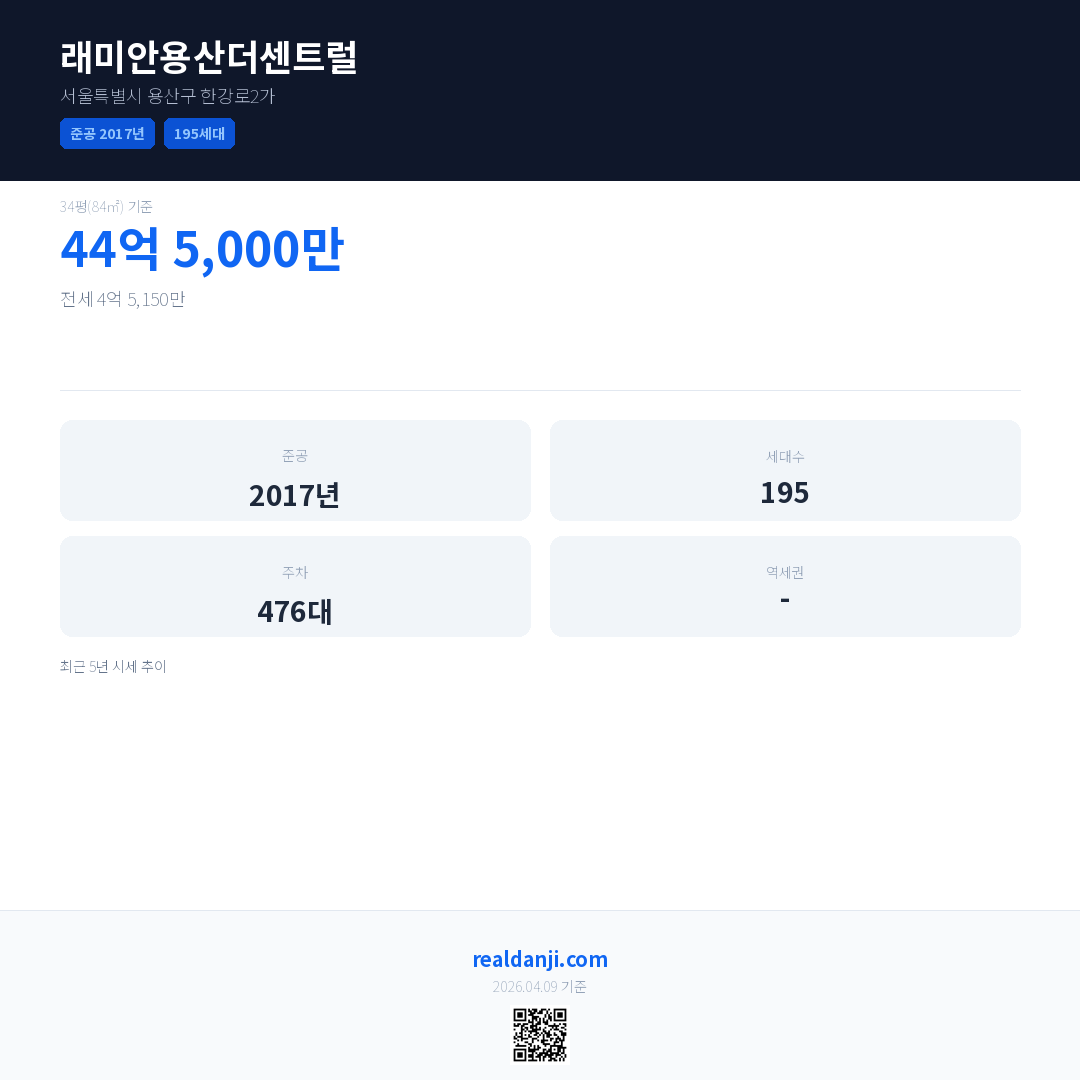 래미안용산더센트럴은(는) 2017년에 준공되었으며, 현재 9년차입니다. 총 195세대 규모입니다.